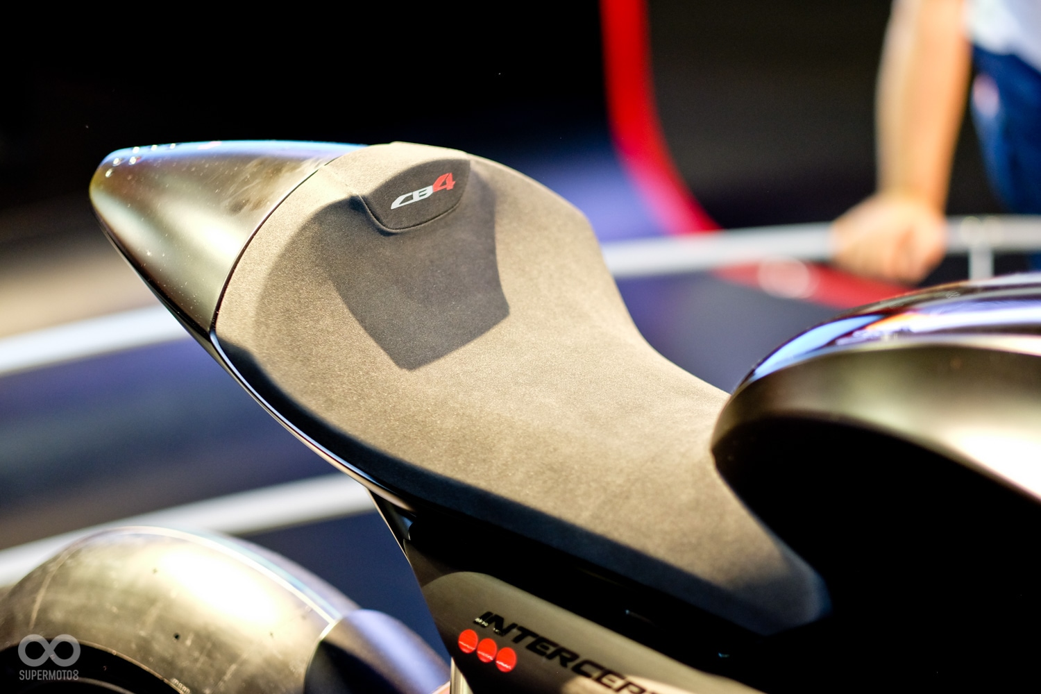 造型上CB4 Interceptor Concept也相當前衛,從頭燈的風扇以及環狀的燈條就略之一二,燈罩向後延伸與油箱完美契合,但下方完全沒有整流罩的配置直接將引擎裸露在外,四缸引擎似乎是1000c.c.的排氣量,因為車尾寫著1000R,而後單搖避的配置將整個輪框裸露出來相當性感,同時前後Ohlins的配置更令人感到性能風味十足,前方的Brembo卡鉗搭配上實心碟盤更有另一種風味,不過我想最令人難忘的應該就是排氣管了吧,從前方四出合一到後方直接融合在車尾當中向後噴射,你以為那個是尾燈的地方正巧是他的排氣出口呢!忘了說,這輛車的尾燈是在車尾上方,所以要知道他有沒有煞車,可能要踮腳才看的到喔!