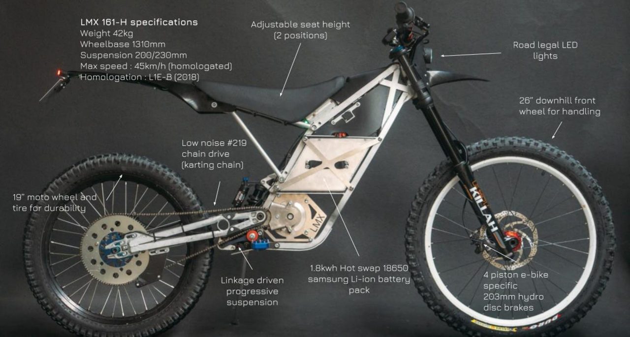 LMX其實是Lightweight Moto X(Cross)的縮寫,意味著這輛車就是輕!用上了鋁合金材質當作骨架,而馬達以及電池則是放在車輛的中央下方,讓車體可以擁有良好的操控性,8kW的馬達相當於10.7hp的動力,不過最高時速被限制在45km/h左右,不過達300Nm的扭力可媲美85c.c.的越野油車,LMX還表示這輛車可以爬上45度的斜坡沒有問題!