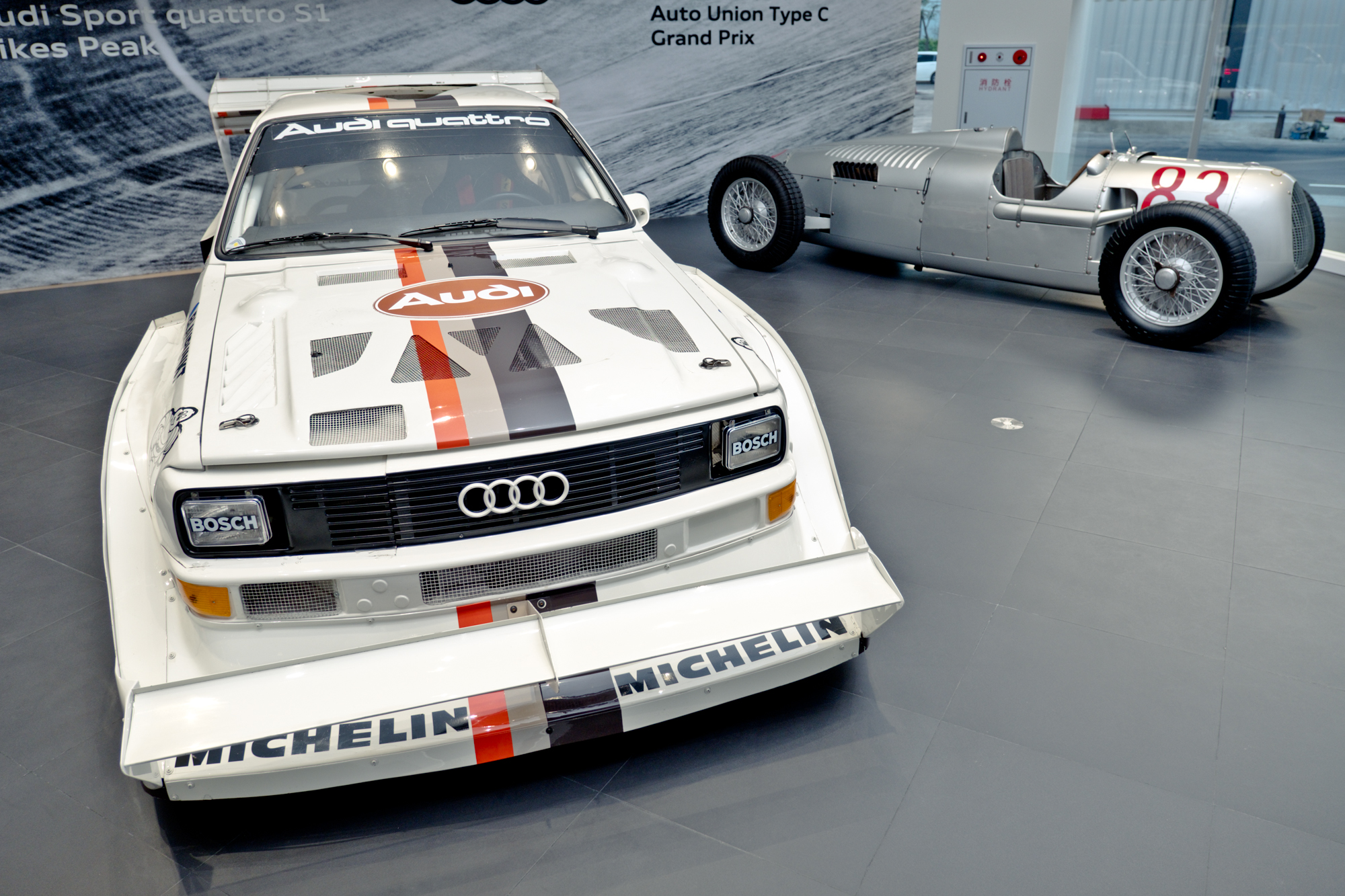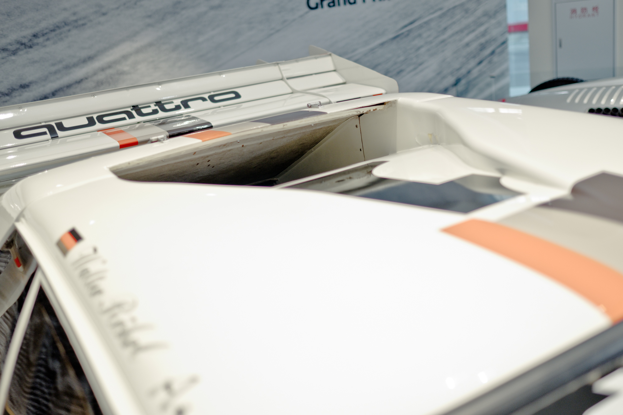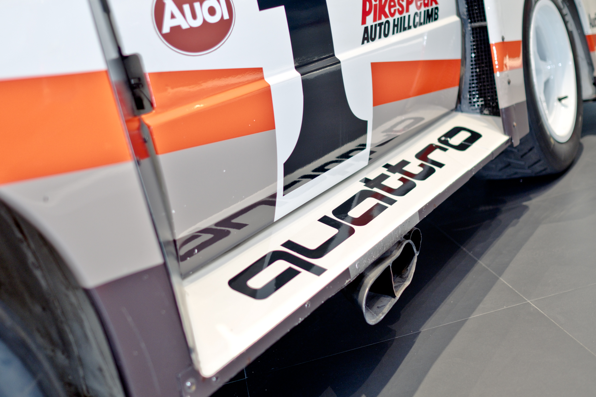 其實Audi早在退出WRC以前就已經在1984年投入Pikes Peak 爬山賽,當時由法籍女性車手 Michele Mouton 駕駛 Audi Sport quattro S1奪下1985年冠軍。隔年由美國車手Bobby同樣駕駛quattro S1,更以11分09秒22刷新記錄。到了1987年,Audi退出WRC戰場之後,WRC老將Walter Röhrl以精湛的技術,創下10分47秒85的驚人成績!而這次來台展出的車輛,就是當年1987年Walter開上派克峰創紀錄的車,這對Audi來說可是寶貝中的寶貝,我們在拍攝時都有人緊盯在旁,因為不能碰到車輛的絲毫,顯見Audi原廠對於這輛車的重視,也看得出來他們對於台灣的重視!