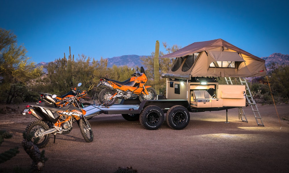 Turtlebacker露營拖車的特別之處在於能夠額外裝載移動載具,位在帳篷後方的拖車平台能夠停放兩輛大型ADV,如果是小排量的越野車可放置三輛,平台可加裝機車固定架與固定繩,除了機車,也可以停放ATV或小型履帶車,能夠讓露營增添更多樂趣,尤其喜歡林道越野的玩家,利用露營車作為補給基地,帶著兩輛越野機車能夠更深入汽車道不了的秘境,滿足探索的冒險樂趣。