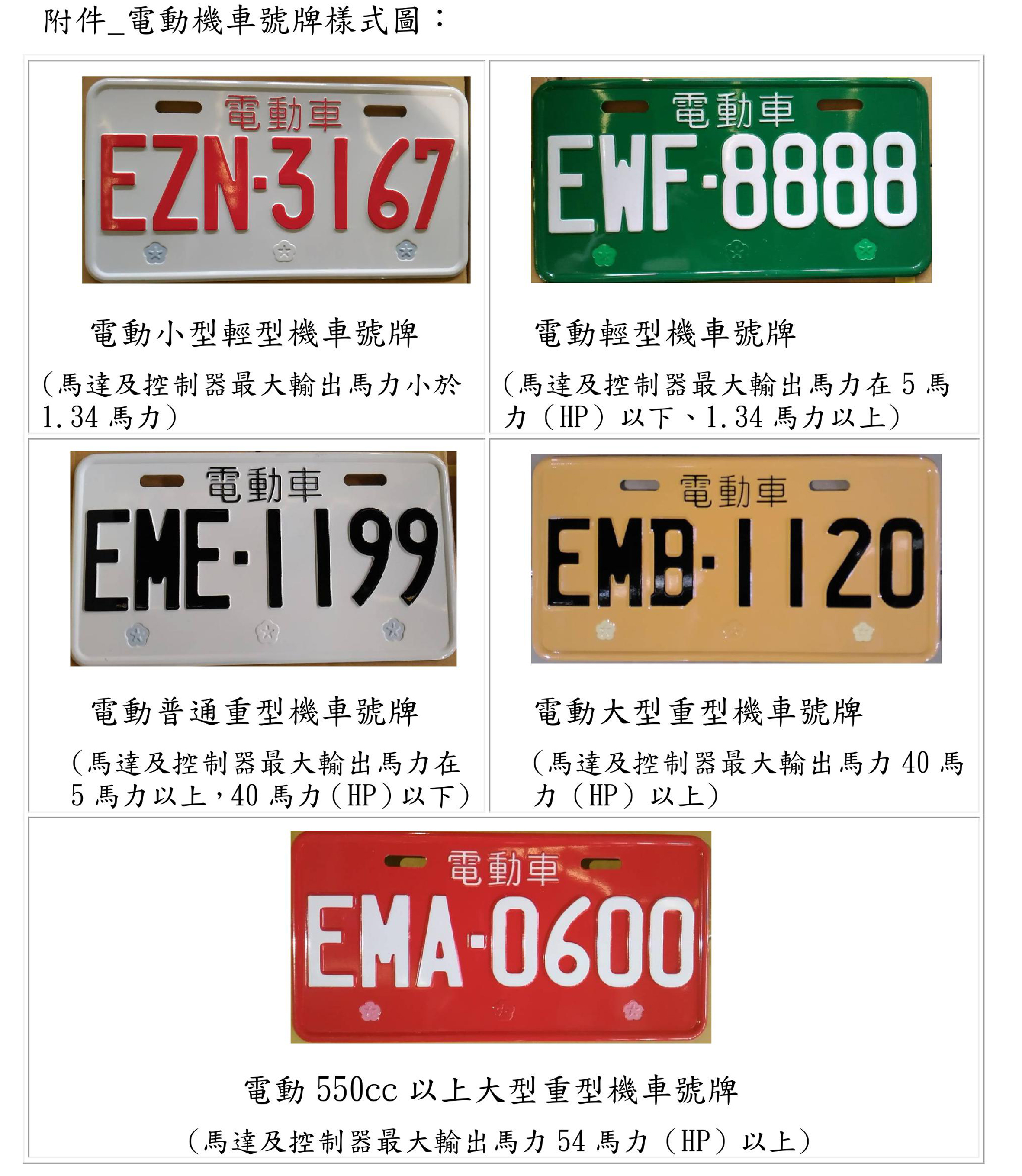 今年106年6/30發佈的道路交通安全規則第11條修正當中,新增電動機車之馬達及控制器最大輸出馬力54馬力(HP)以上懸掛紅底白字的大型重型機車車牌。而從2018/1/1開始,包含電動小型輕型機車、電動輕型機車、電動普通重型機車、電動大型重型機車、電動550cc以上大型重型機車等5款號牌。其代碼第1個英文字母均為「E」(electric),代碼代號均為前3後4(如EMB-5678),號牌規格、顏色、材質、防偽辨識及字體樣式等,均與現行號牌相同,僅於號牌上方加上『電動車』字樣。