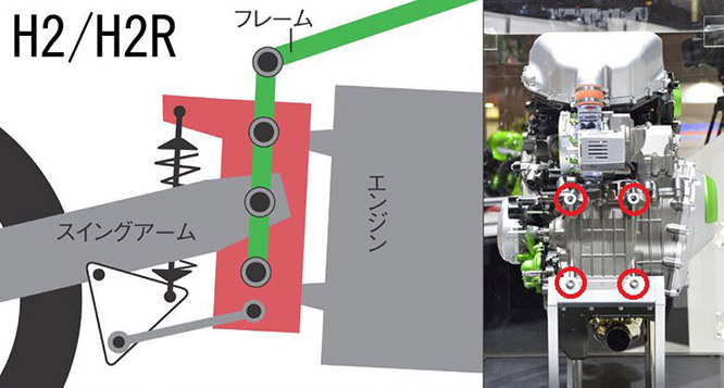而H2所使用的新設計則是在引擎的後端延伸出一塊高剛性的平台,引擎、車架、搖臂、懸吊均與平台相連,透過四點式的鎖附平台的受力能均勻的施加於引擎本體,如此一來重心能壓得更低,結構簡化剛性卻能大幅提升,而重量也能壓得更低,加上避震安裝角度不再受限,軸距也能有效縮短,而這也是Ninja250/400能如此強大的一大主因。