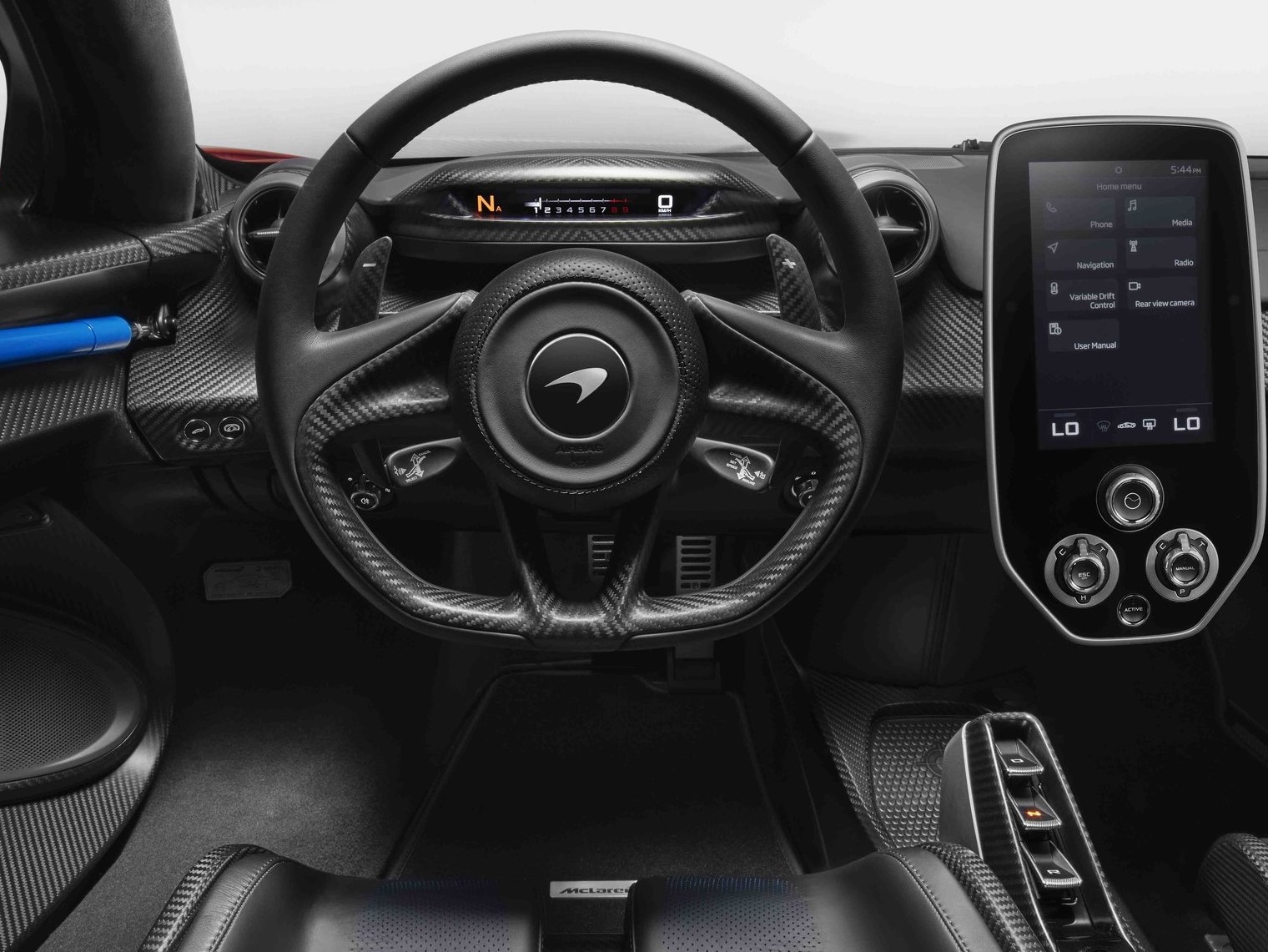 動力配置採用的是M840TR的4.0升V8雙渦輪增壓引擎,這也是McLaren有史以來推出的馬力最強公路用引擎機型,可輸出800ps最大馬力,峰值扭力高達800Nm,駕駛還可以切換舒適/運動/賽道等多種模式。此外還搭配適合賽車用途的乾式油底殼以及平面曲軸設計,組件輕量化也讓運動慣性得以降低,同時雙渦流渦輪和電控洩壓閥都對於油門反應的提昇更有幫助。而車頂上的「呼吸管」和排氣管設計以及引擎位置,也考慮到引擎不同轉速下的高頻與低頻聲浪有更諧調的搭配,甚至讓車內駕乘者感覺這組V8引擎宛如就在身旁。而變速系統選用的是雙離合器七速自手排並搭配換檔撥片,其中撥片長度還考慮到穿戴手套,確保駕駛可以與機械之間有深度連結。