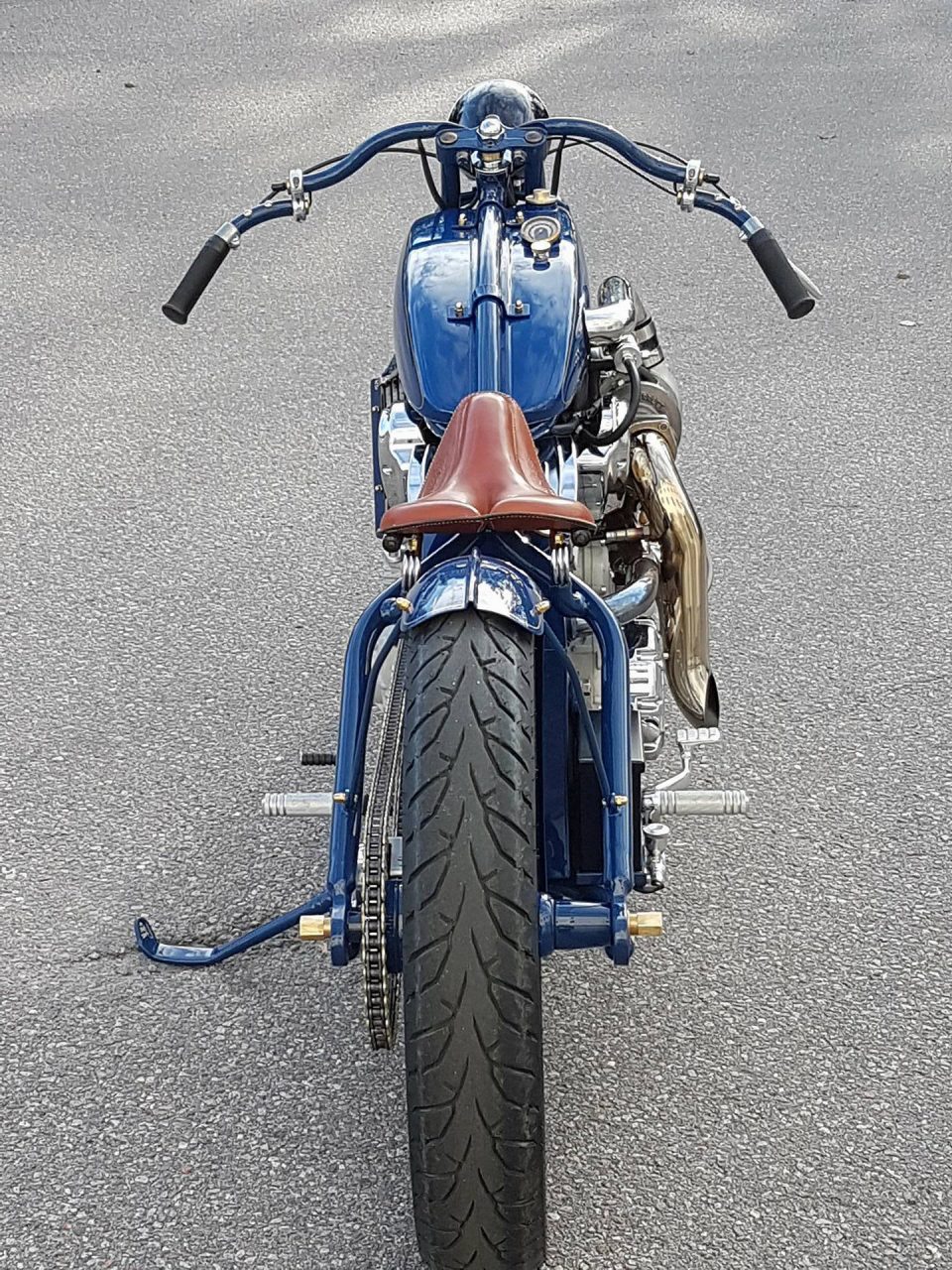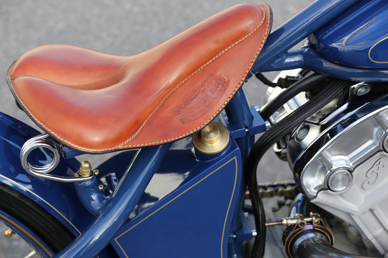 Hardtail硬尾車架是則是全手工打造,後避震改以真皮座墊下的彈簧取代。不鏽鋼洩壓閥則盡可能靠近車身安置,免得破壞線條。原來的汽油幫浦、頭燈及變速踏桿是少數幾樣被保留下的零件。