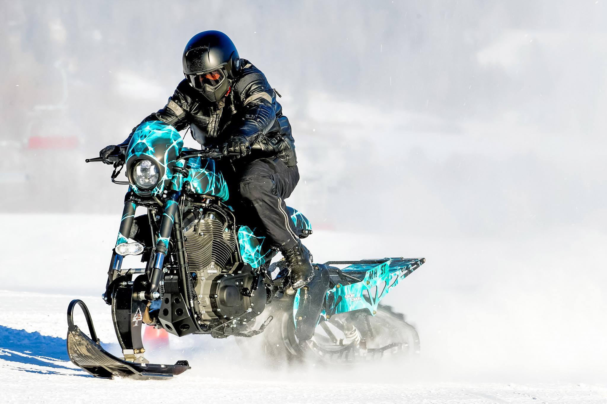 使用的車款是經過大改的Sportster,其動力心臟傳出擁有比原本車款多一倍的動力,而車身的輕量化就更不用說了,畢竟是要進行直線加速賽事,而為了因應雪地所需,輪胎當然也有所不同,胎面有釘子、螺絲甚至是板子來增加雪地上的抓地力,並且將後搖臂加長將近一寸,同時也加寬讓它可以容納特殊的輪胎,這將會顛覆你我想像中的哈雷樣貌。