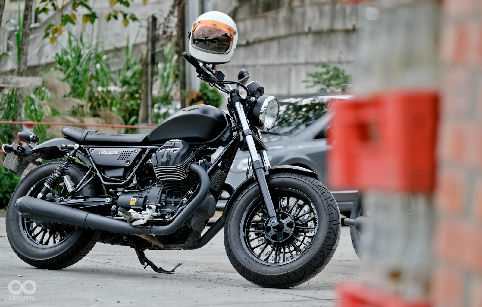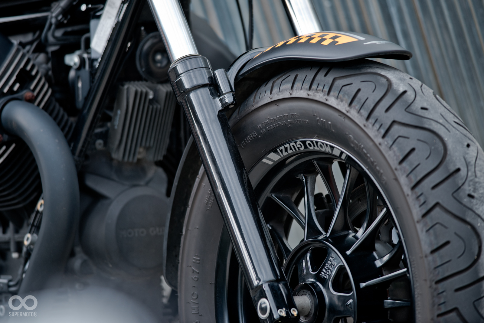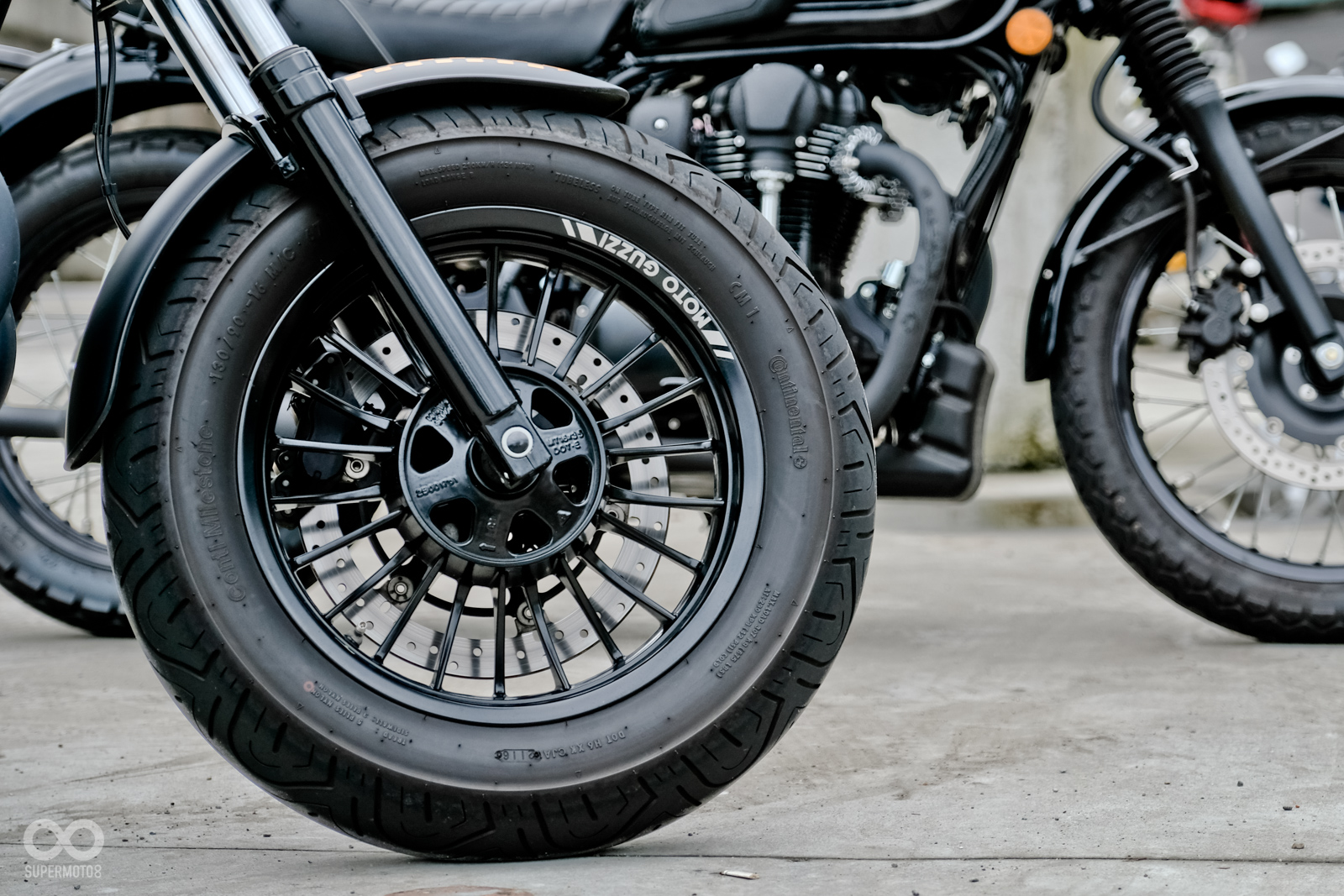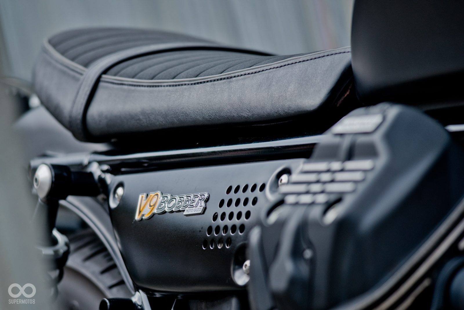 除了標誌性的縱置V缸,在造型的掌握與拿捏上V9 Bobber幾乎可以說是教科書等級,經典的雙搖籃式車架由鵝頸延伸,一筆拉到車尾乾淨利落,而結束的點不偏不倚落在後輪軸的正上方,精悍的水滴狀油箱折線銳利好似鑽石,緊鄰的椅墊厚薄適中尾端為翹帶出動感,前後輪匡雖是鋁匡但促密的輪輻營造的美感不亞於鋼絲匡,而前100/90 R19後150/80 R16的胖胖胎更是畫龍點睛,在曼妙的線條中加入了些美式的粗獷感。