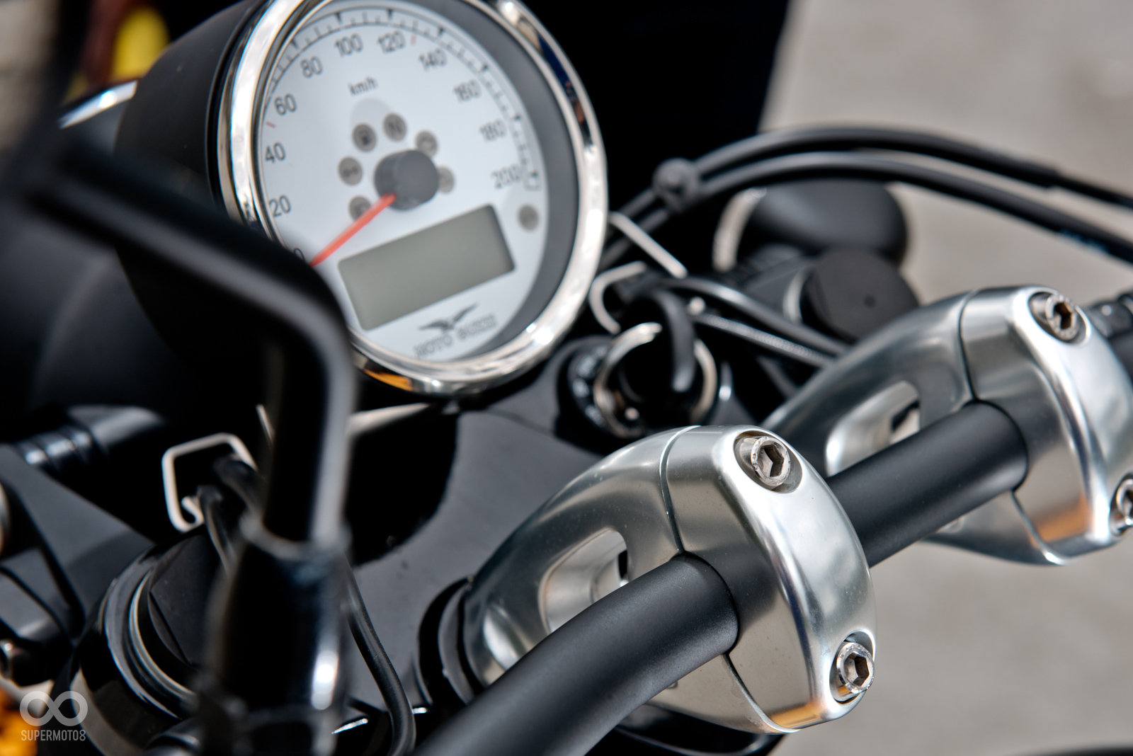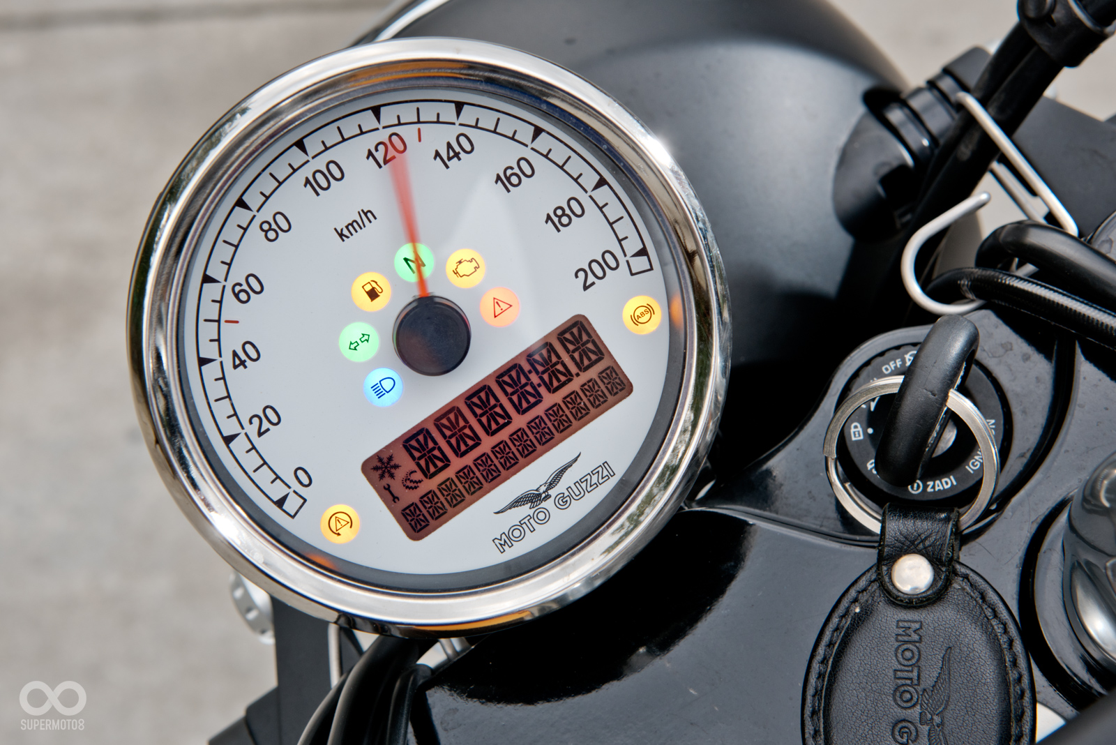 Moto Guzzi V9 Bobber外觀經典復古,但在配備上可一點也不old school,經典的單環錶內含一只小LCD螢幕,除了能顯示基本的行車資訊,還能顯示包含氣溫、瞬間油耗、引擎運轉時間等資訊,此外V9還搭載了雙回路的ABS系統,以及近年相當受到重視的循跡系統MGTC也同步登陸到了這台新經典上頭。
