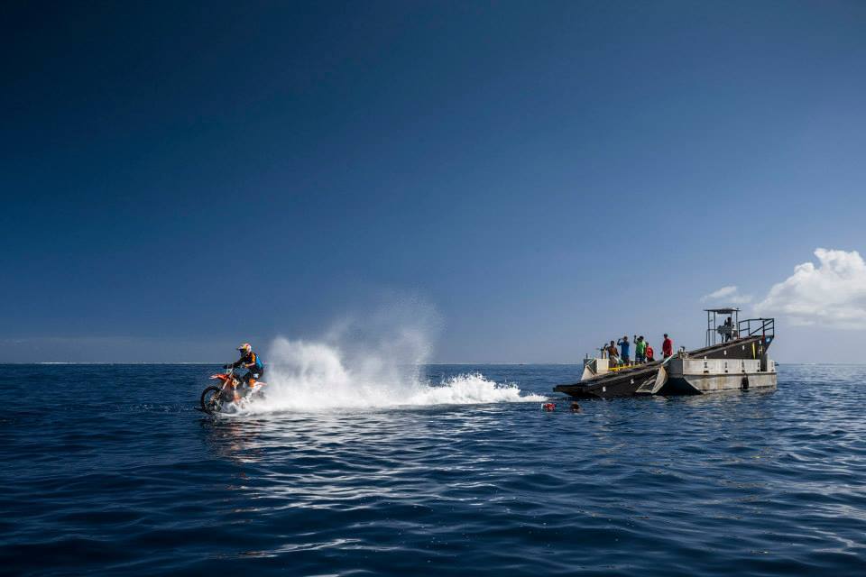 拍攝小組防止摩托車在收油時沉入水中,他們改造了一個有坡道的工作船,好讓Maddison可以順利進出