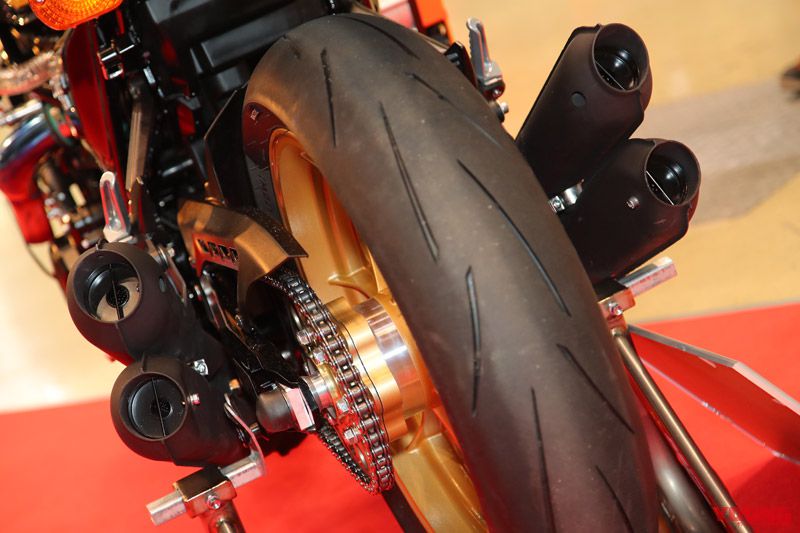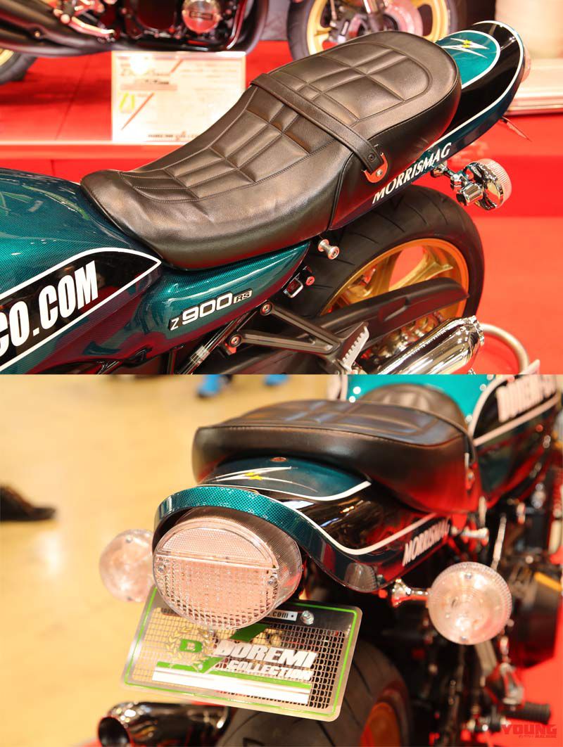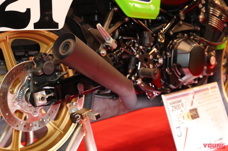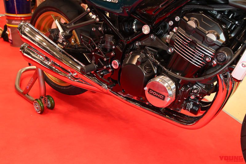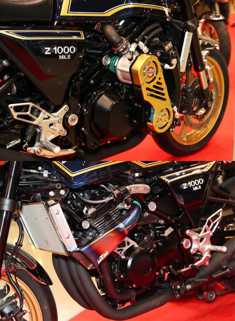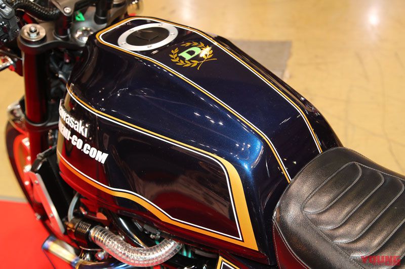 DOREMI COLLECTION 將這個獨具風格的身形設計挪到Z900RS 上,開發出包含油箱(外殼,下有內油箱)、側蓋、坐墊與尾殼的套件。除此之外,展示車上還裝了機械增壓系統,這個套件是MS SAILING 所設計的產品,葉片與皮帶裝在引擎右側,左側為進氣管。