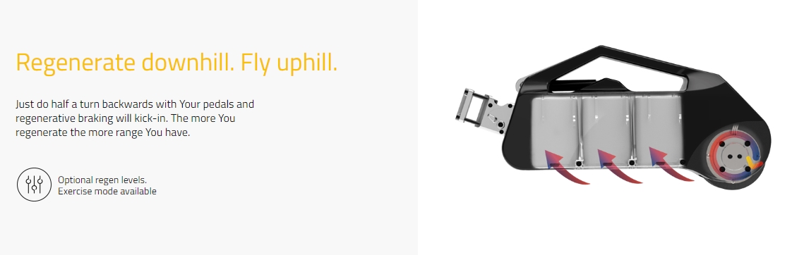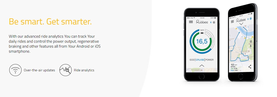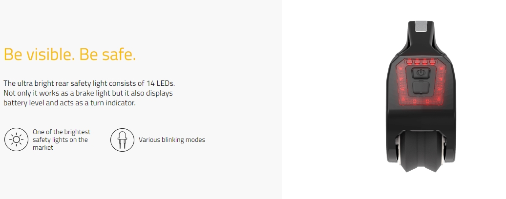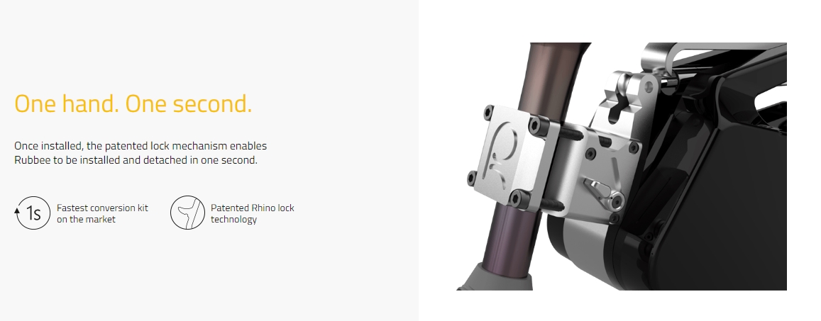 全新的Rubbee比起以往的商品輕了50%,這是因為在這次的產品上一改先前全金屬的設計,這樣也讓Rubbee X的安裝速度快了不少,以往的產品安裝大約需要7秒,現在Rubbee X只要一秒就可以完成安裝,而且踏板的傳感器是完全無線的,省去了不少麻煩,並且在後方還有14個LED燈組成的煞車以及方向燈,提供夜晚騎乘的安全性,搭配電池最重也才4kg而以,真的非常方便使用。