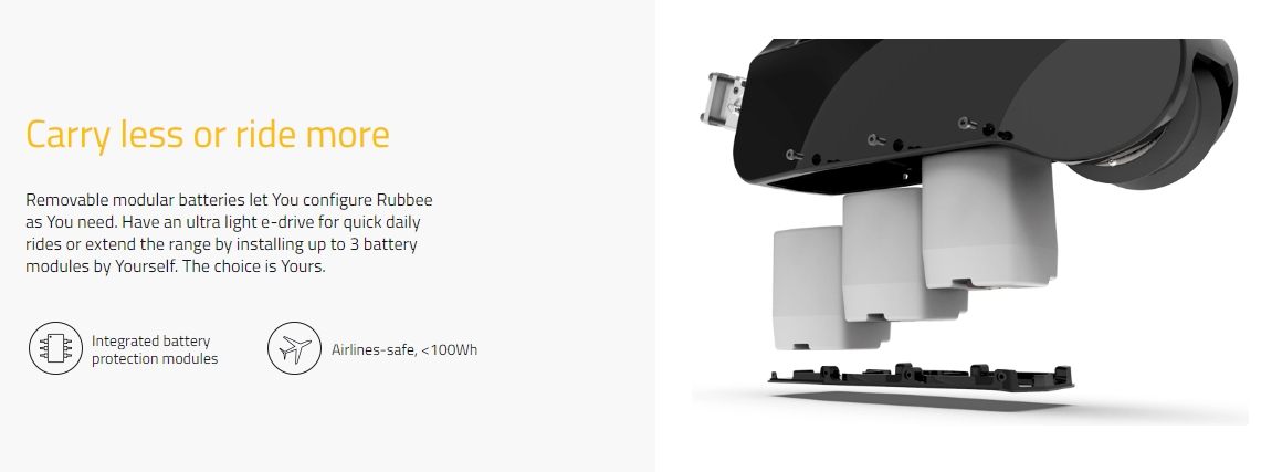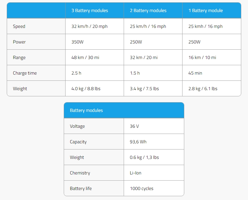 Rubbee X可以搭載3個專用鋰電池,同時也是透過鋰電池來控制馬達輸出效能,只有一顆或是兩個電池的話,將會提供250W的動力,最高時速來到25km/h;但如果裝上了3顆鋰電池則進入了Power模式,提供350W動力以及32km/h的最高時速,充電時間以及使用里程可以參考下方表格,值得一提的是專用的鋰電池每一顆只有93.6Wh的電量,所以可以攜帶上飛機沒有問題,你只需要把安裝配件帶著,就算出國你也可以輕鬆騎車。