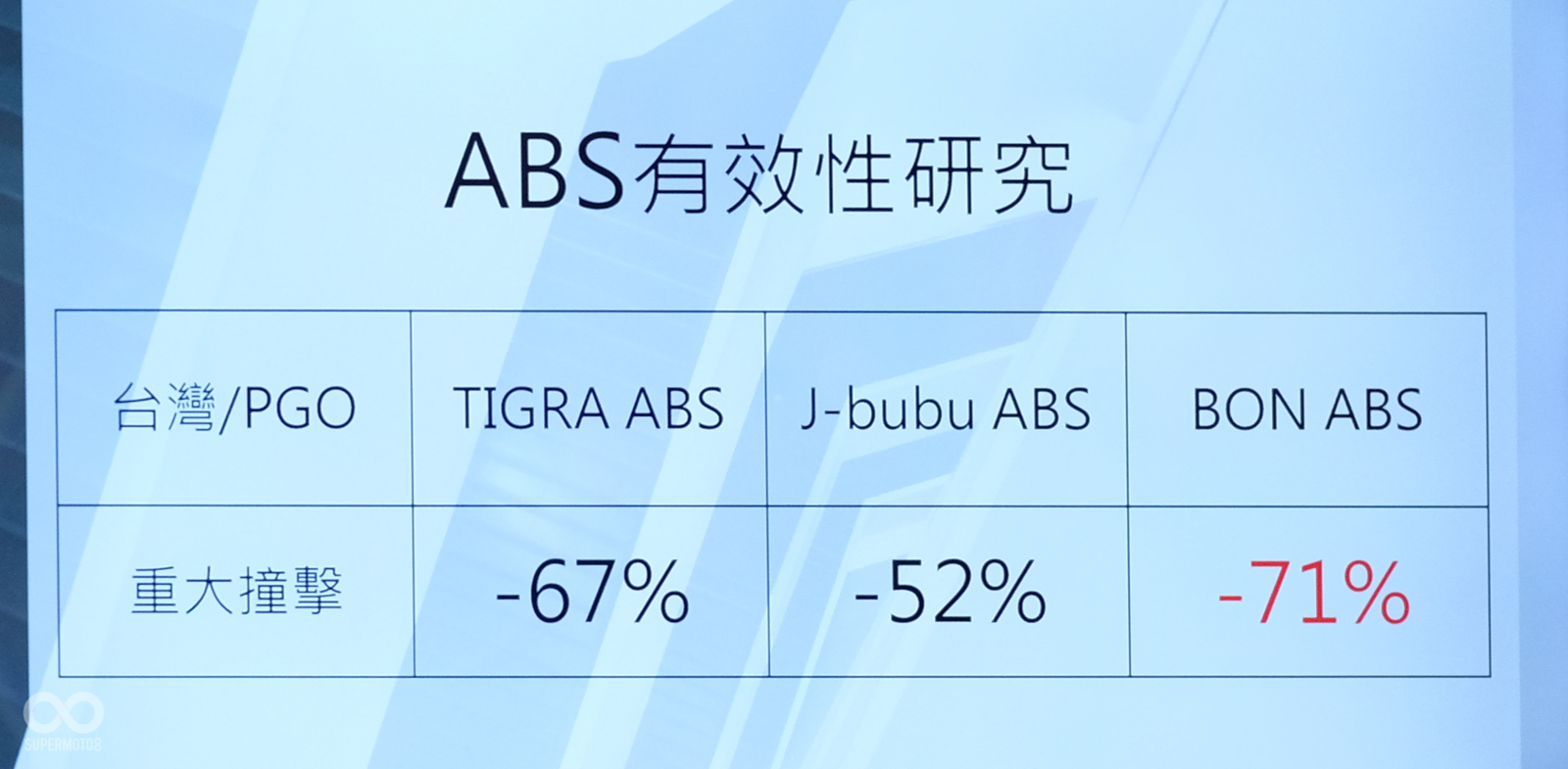 2019年,政府將強制126c.c.以上車款搭載ABS系統,125c.c.以下則需搭載CBS或ABS系統,PGO自從2012年將旗下車款導入ABS系統後,根據內部數據顯示PGO ABS車款能夠預防將近25%的重大事故發生,目前PGO旗下已超過三成售出車款皆為搭載ABS、CBS車款,透過本次改款加入更多便利、舒適配備,為國內消費者帶來更好的騎乘體驗。