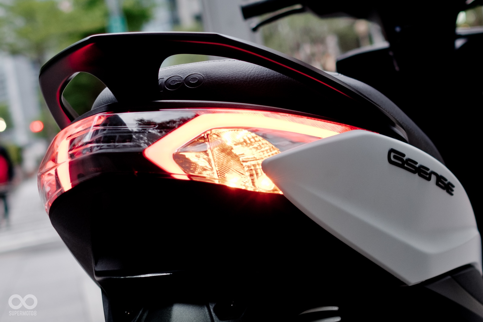 將目光轉往G SENSE 125,在圓弧外表下可是藏有許多細微的折線,銳利的線條設計已不復見,取而代之的是龍頭上顯眼的鑽石多邊形大燈、位於前斜版的方向燈與日行燈組成就了簡潔的燈組設計,尾燈採用導光條搭配LED煞車燈,前、後方向燈依舊維持傳統燈泡設計。