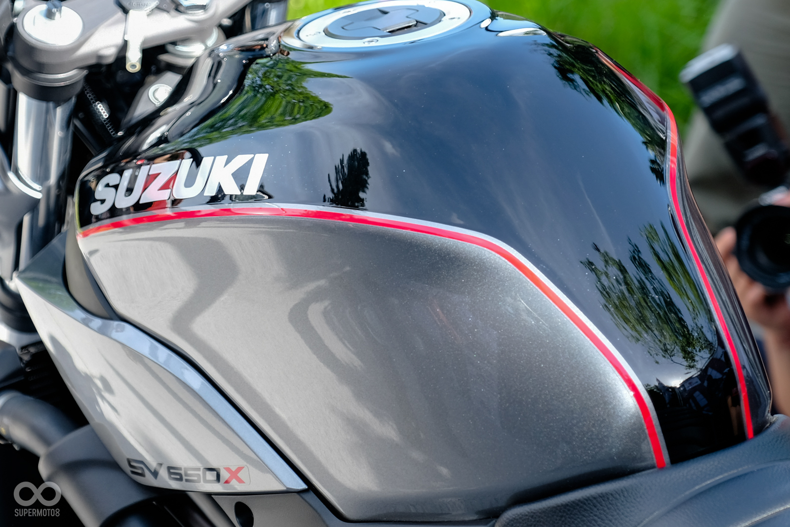 SV650原有的車體設計不同於他廠的復古街車外型,以圓燈搭配較為上翹的車尾呈現出介於經典與戰鬥兩種風格之間,SV650X則是透過油箱下方的專屬飾蓋,搭配上鋼管編織車架讓車輛的視覺效果更加飽滿,本次改款中也取消過往油箱上頭的"S" Logo,重新以經典的SUZUKI字樣彰顯身份。