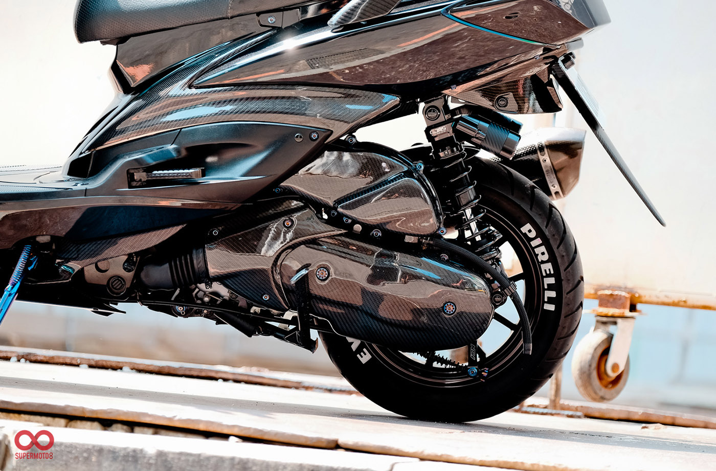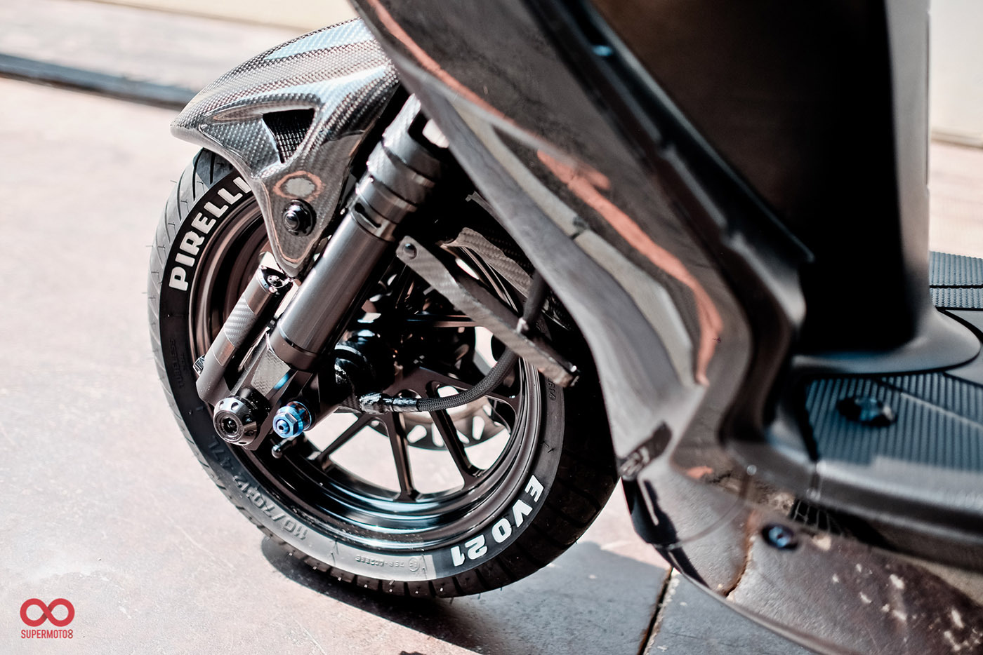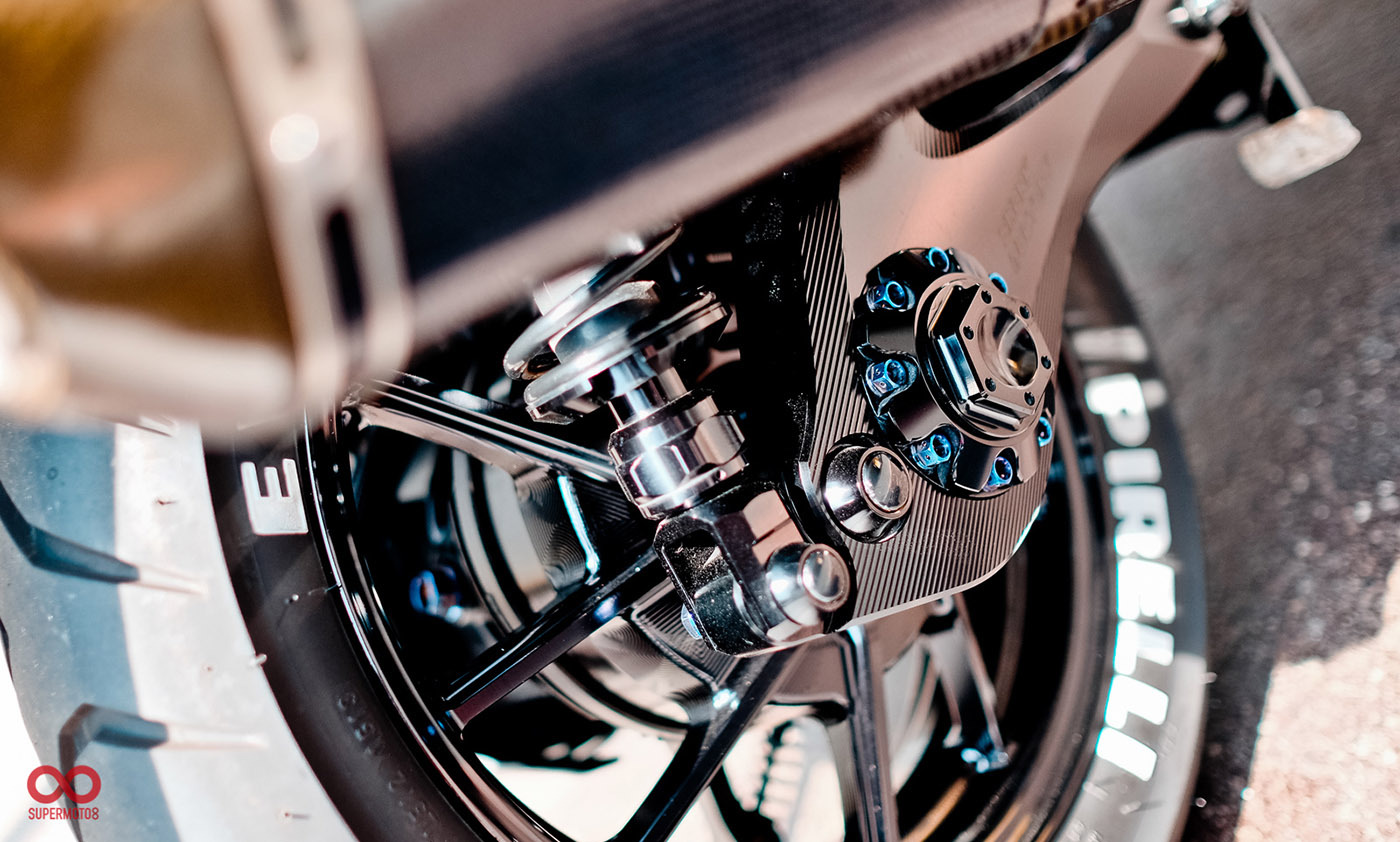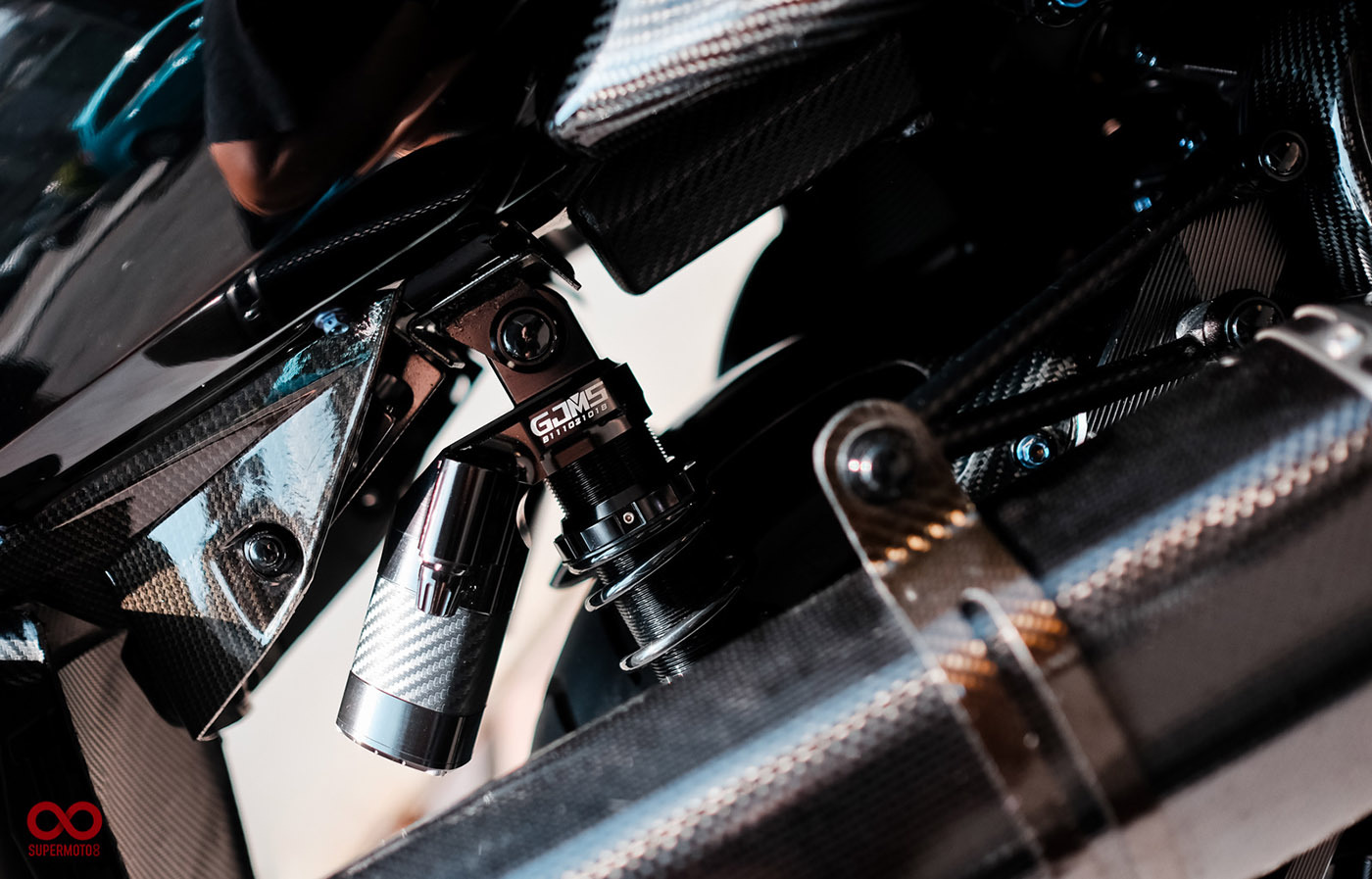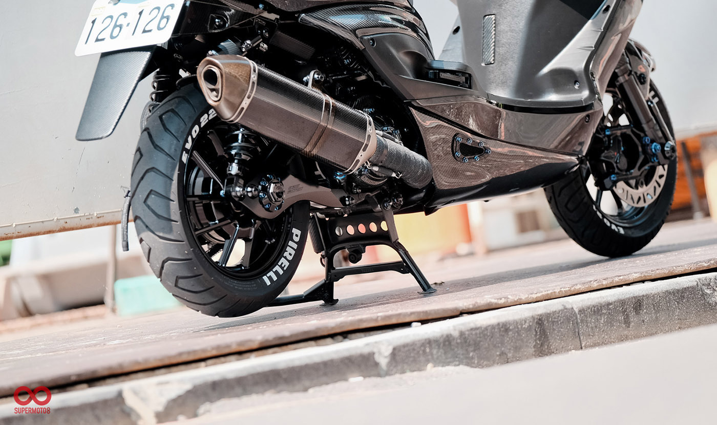 而當我們靜下來細細研究車身部品時又發現改裝者超強的手藝,前叉防塵蓋、前後避震器氣瓶、油管支架、等.....透過DIY包覆碳纖維紋路讓質感再進化,甚至吹漏盒編織油管都是出自於改裝者之手。這是一個往細節裡面改的態度,也因為這樣的用心讓這台車散發性感細膩的黑色氣質。讓我們來欣賞這精品等級的黑潮 CYGNUS-X 2代目吧。