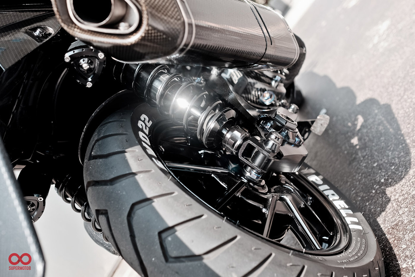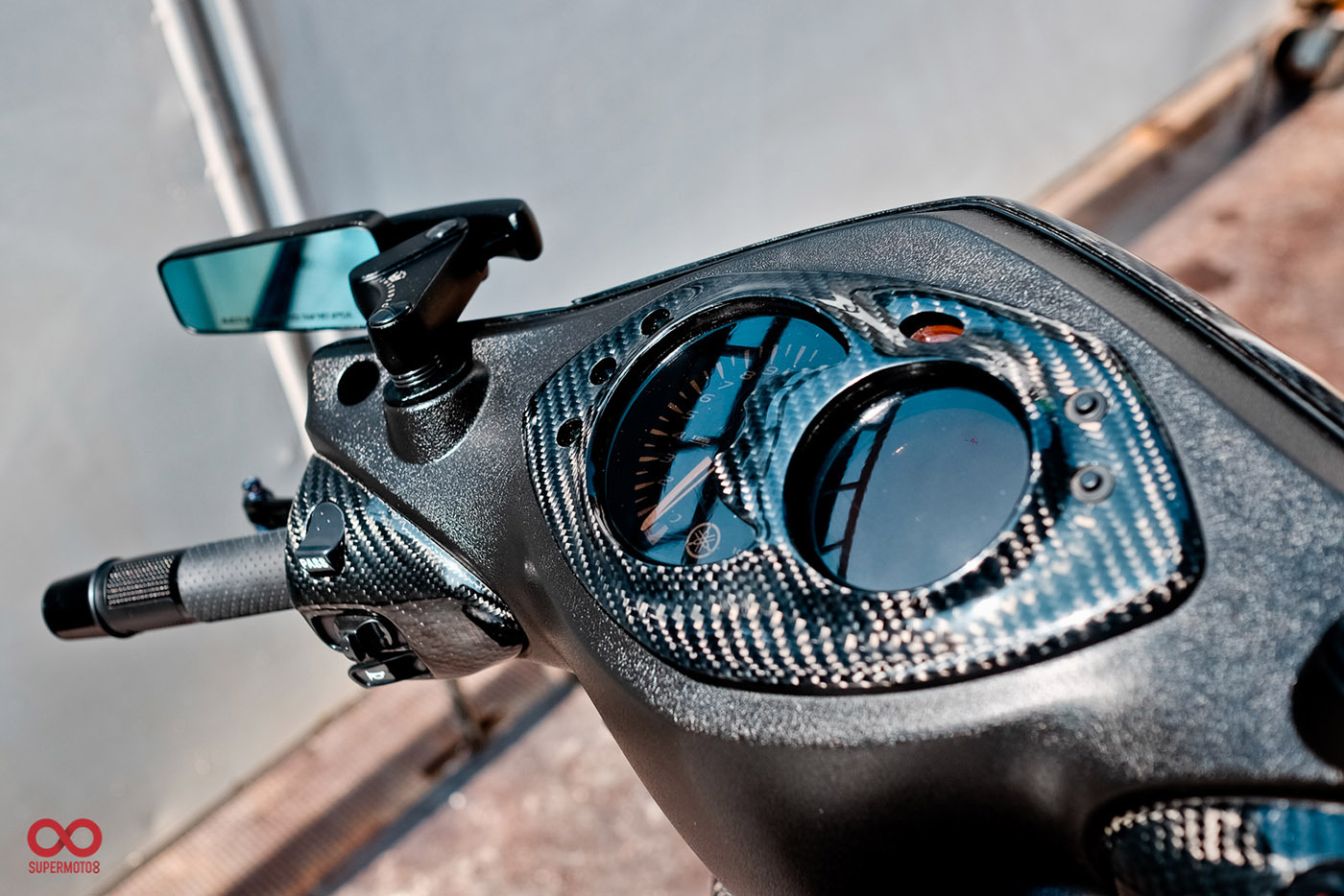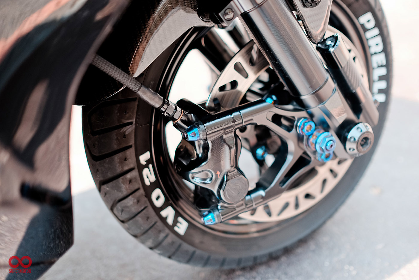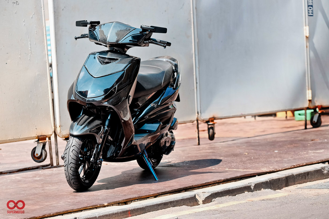而當我們靜下來細細研究車身部品時又發現改裝者超強的手藝,前叉防塵蓋、前後避震器氣瓶、油管支架、等.....透過DIY包覆碳纖維紋路讓質感再進化,甚至吹漏盒編織油管都是出自於改裝者之手。這是一個往細節裡面改的態度,也因為這樣的用心讓這台車散發性感細膩的黑色氣質。讓我們來欣賞這精品等級的黑潮 CYGNUS-X 2代目吧。
