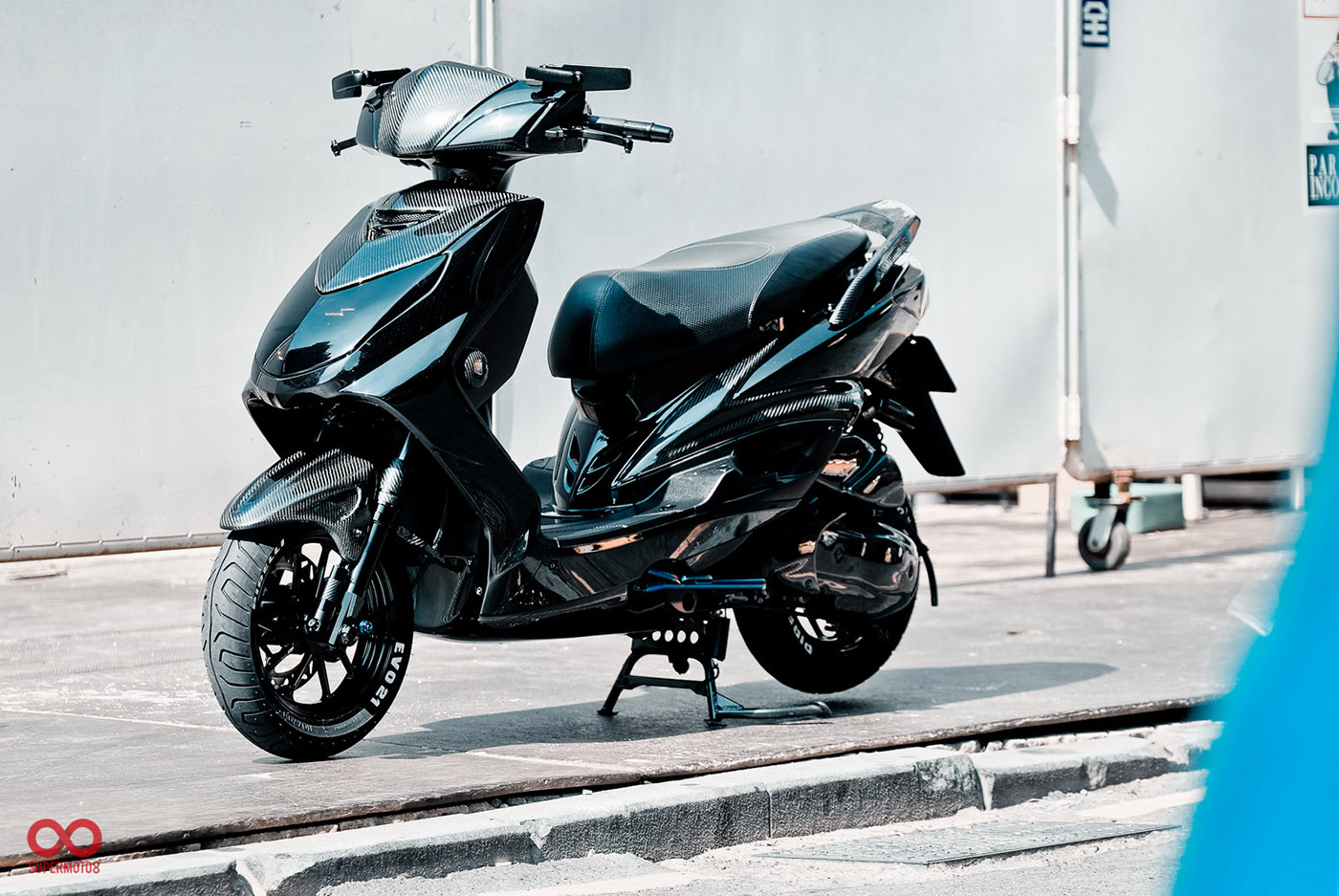 改裝者(健二)是個視覺改裝高手,凡經過他手下的大小車輛都散發強烈的視覺張力。當我們第一次見到這台車時就被他全黑暗的車身所吸引,景物順著車身線條反射在黑色車身上,與碳纖維的交織讓黑暗有了層次,反著四周光線的細緻質感近距離看都覺得驚嘆。除黑色與碳纖維套件外車身還使用了大量的鈦螺絲做點綴,燒色的鈦藍在整片的暗黑層次中就像發亮的寶石一般奪目,讓這台CYGNUS-X細膩度推向極致。