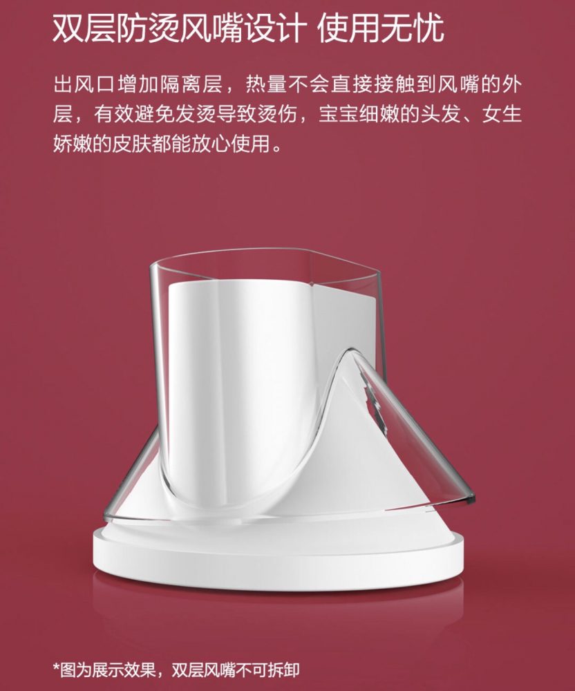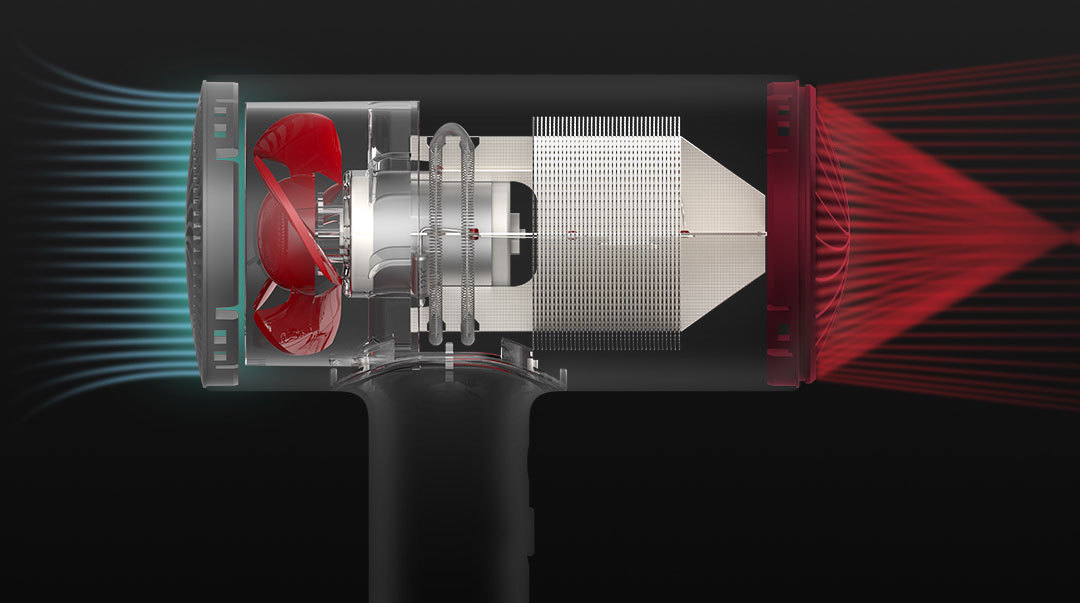 而內部的圓筒也不是採用中空的設計,號稱擁有錐形倒流體,可以讓風量再次增加,加上內建負離子設計,不僅可以快速吹乾頭髮,同時提供增加柔順、減少毛躁的效果,功能的選擇上共有三種:熱風、自然風跟恆溫,這一點與一般普通的吹風機差不多,但值得一提的是這個吹風機的風嘴有2層設計,強調在吹頭髮時不會接觸到高溫風嘴,可以有效保護使用者的安全。