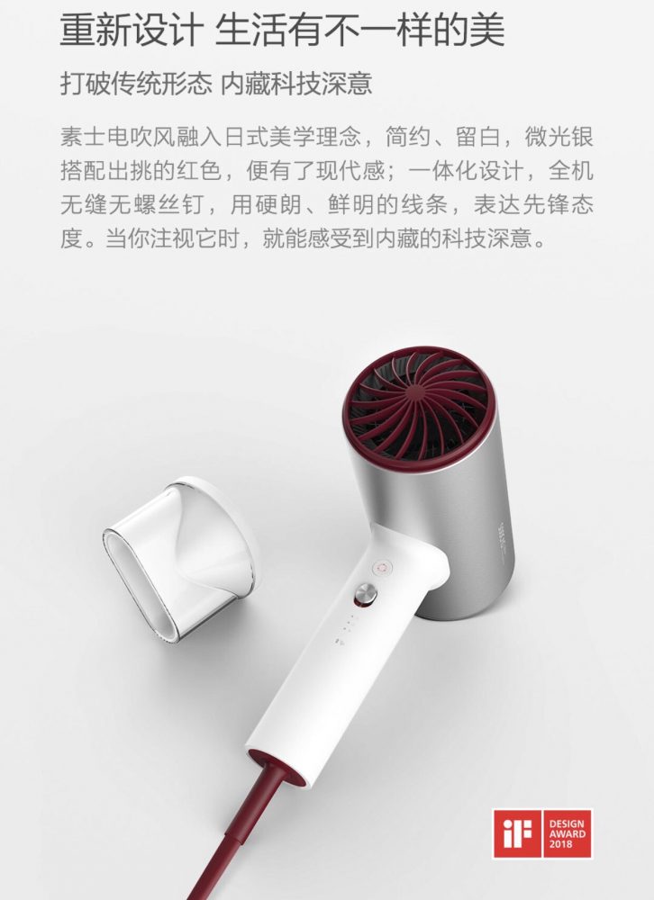 雖然這不是小米品牌的商品,而是小米生態鏈(小米有品)旗下的舒可士Soocas科技開發的產品,這款素士負離子速乾吹風機的外型,與Dyson Supersonic太相似了,讓人再次佩服大陸的設計功力,而且他們靠著這樣的設計還獲得了德國IF設計大獎的肯定,鋁合金的外殼以圓筒的方式呈現,基本上跟Dyson的產品沒什麼差別,當然大小還是有著不太一樣的地方。
