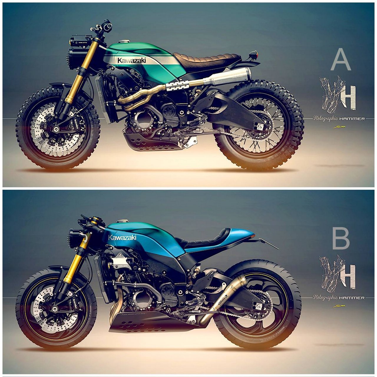 日系跑車在賞味期後確實容易看起來過時,這正是改頭換面的好時機,Holographic Hammer將這台ZX10R拆解只留用骨架,換上鋼絲框越野胎、復古圓燈與駝色皮椅,再搭配那單側的擴散管管。完全就是復古山車風。另外他們也提出一個咖啡的選項,圓燈配上分離斜把、單座、蠍子喇叭口排氣管。同樣精緻度一拜且風味十足,讓人非常期待實體改裝車的出現。