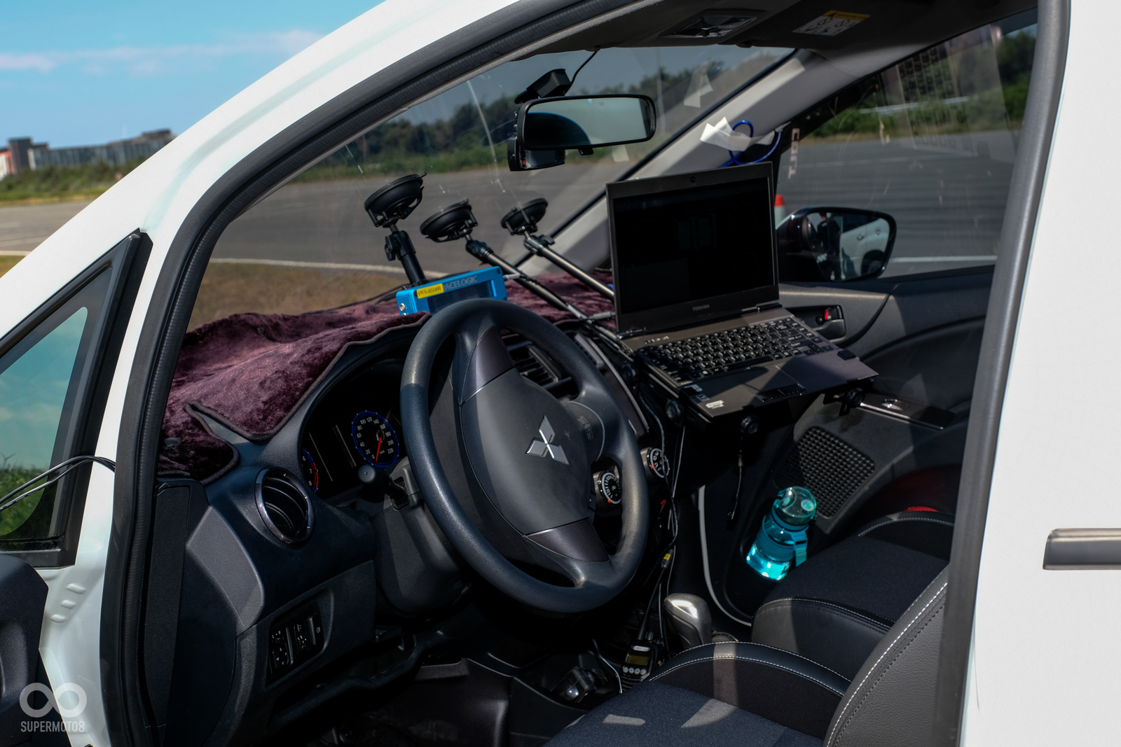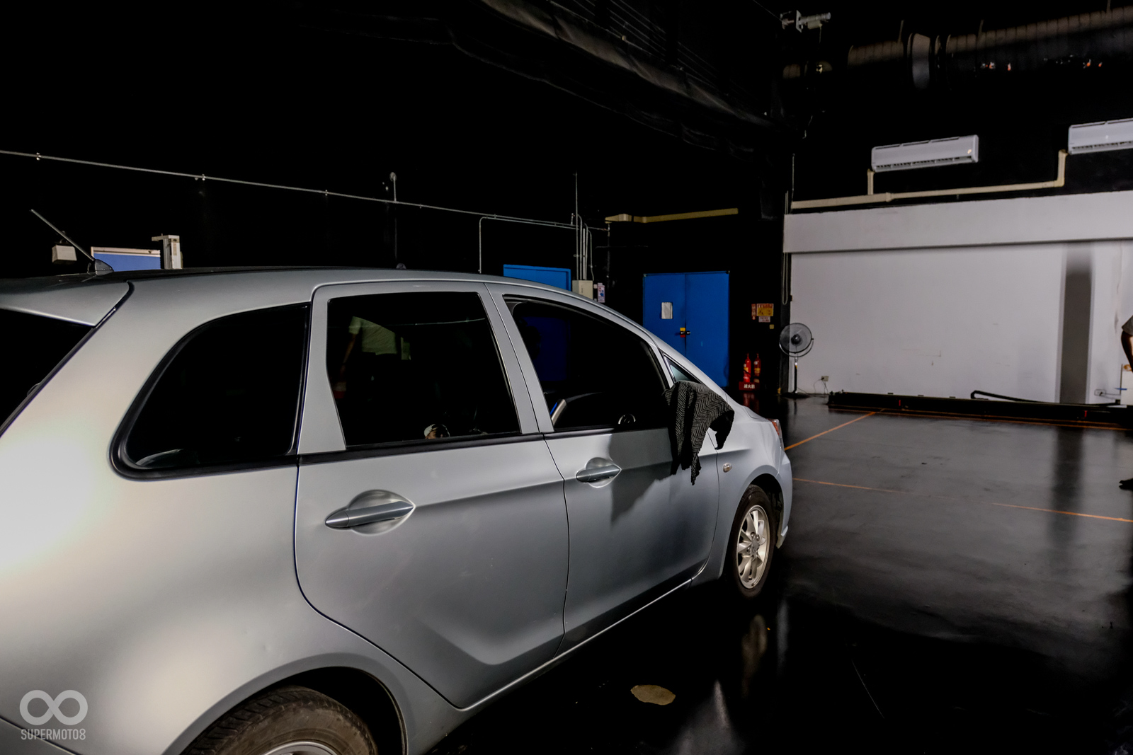 透過照片可以看見場地中央停有受測車輛,本次示範的檢測情況以駕駛側後方視野作為示範,在駕駛座中有著經由複雜機構建構而成的模擬假人,透過車廠所設立的基準R點(大約是人體的髖骨位置),作為機構安裝時的定位點,往上量測635mm即為模擬中的人眼位置。