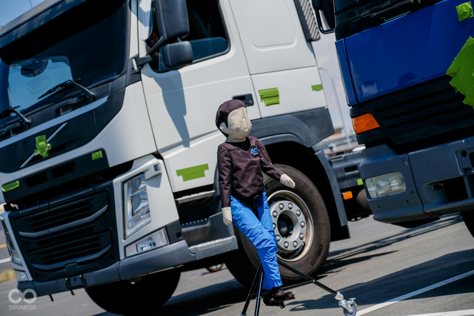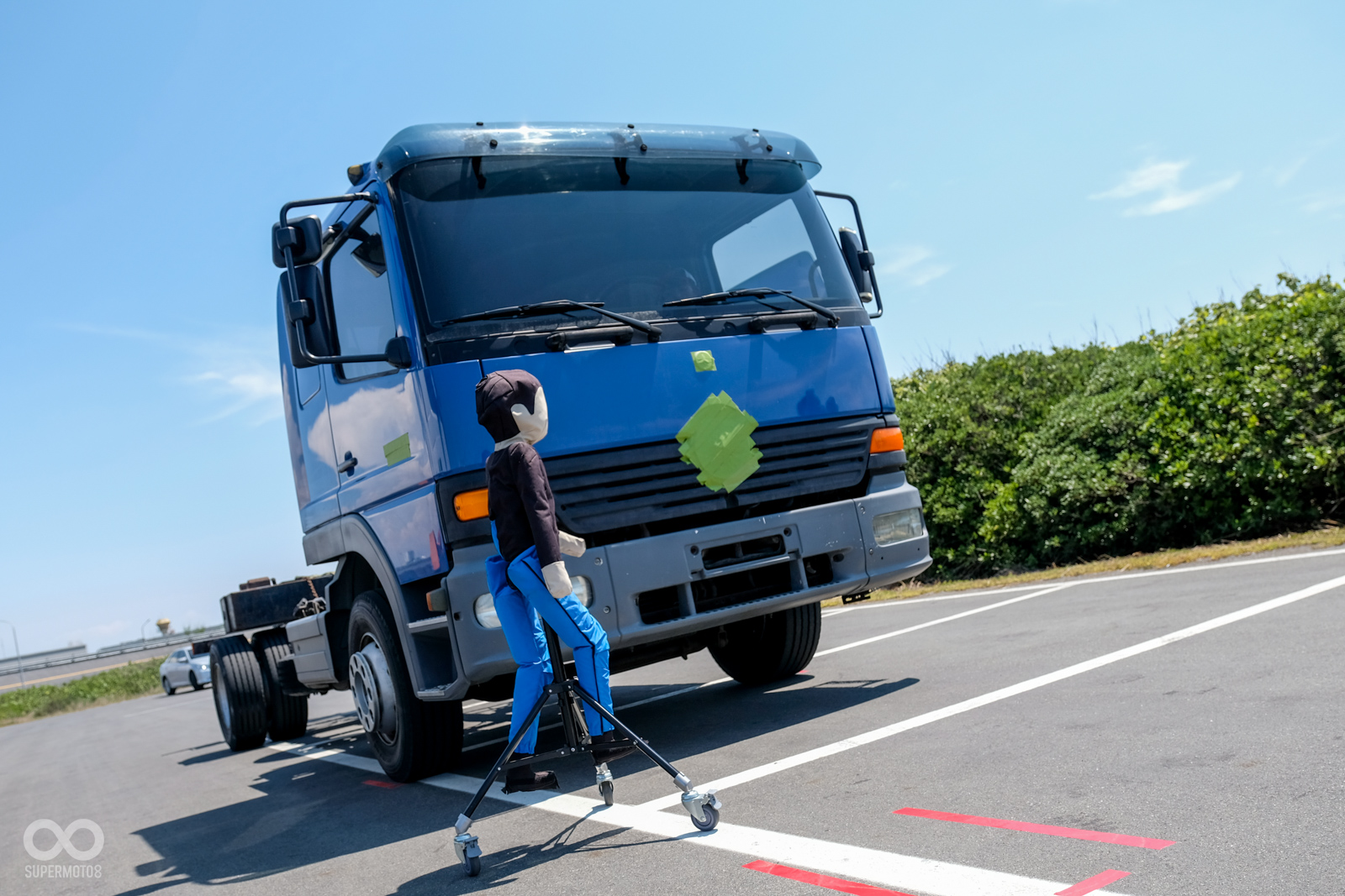 另一輛藍色的大貨車則是車頭盲區的體驗活動,在車外我們可以清楚看見一具藍色假人聳立在車輛左前方,但由於假人與車輛的相對距離過近,加上大貨車本身位置較高,駕駛人在正常坐姿下完全無法看見這位行人,以筆者180cm的身高須將頭幾乎貼上擋風玻璃才能夠看見車前的物體。