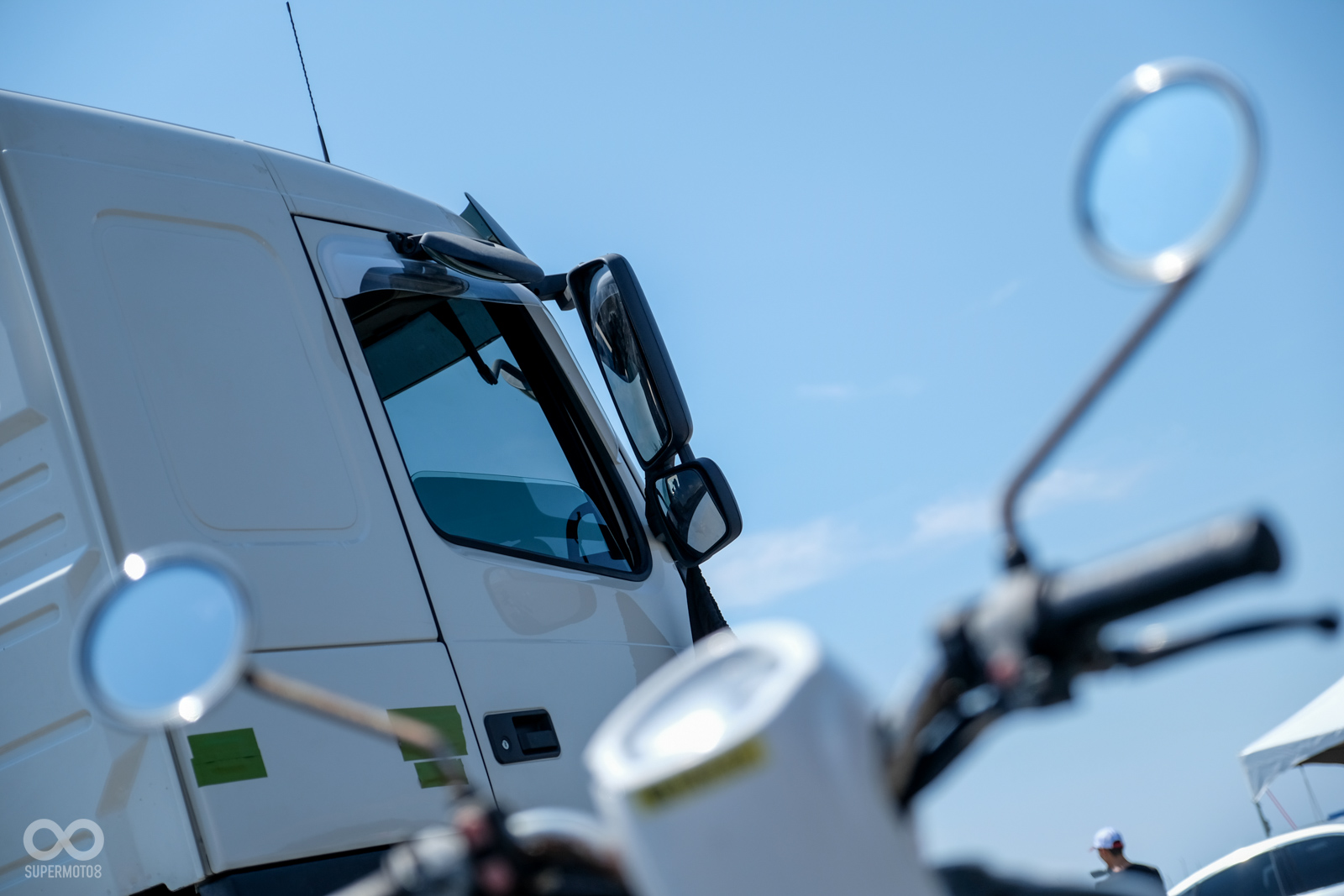 白色車輛為符合現行規範的車款,ARTC在副駕駛座旁擺放了一輛摩托車,並且透過黑布遮蔽側邊下方的廣角鏡,再黑布遮蔽的情況下,一旁的機車的確是無法被看見的,但是將黑布取下之後機車去時可以清楚出現在大車駕駛的視線當中。