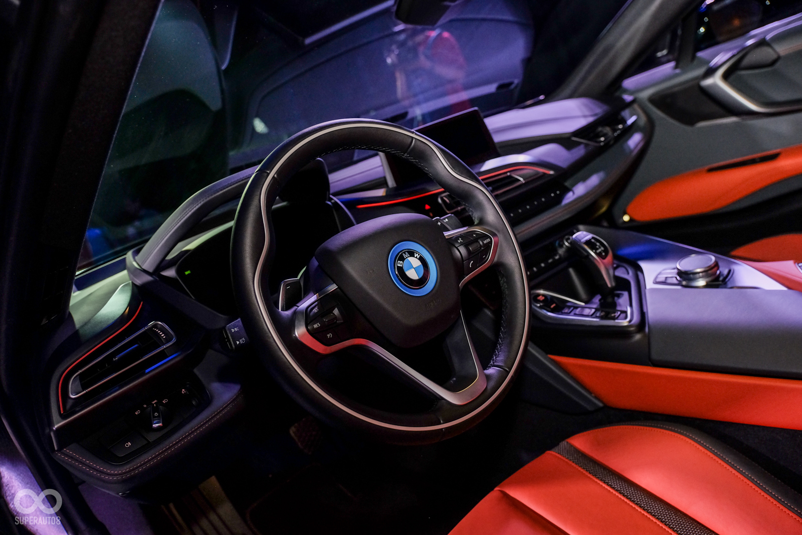 全新BMW i8 Coupe與BMW i8 Roadster的內裝鋪陳呼應運動化且富科技感的外觀,標準配備跑車式多功能真皮方向盤含換檔撥桿、最新iDrive (ID6)介面、8.8吋中控觸控螢幕、陶瓷iDrive控制旋鈕含i8專屬刻印、Dry Carbon碳纖維陶瓷飾板、BMW i interior design Halo天然皮革包覆含藍色縫線等。