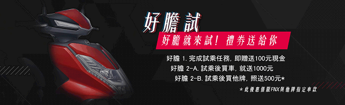 若一試鍾情,只要在原試乘車行購買FNX,就可享第二重A好禮:1,000元SOGO禮券。不只如此,若試乘後無緣購買FNX,而是購買下列任一FXN同級車款,SYM照樣送你第二重B好禮:500元SOGO禮券,一起拚台灣經濟!(SYM FNX 同級車款:勁戰車系、FORCE車系、SMAX車系、Racing車系和G6車系)