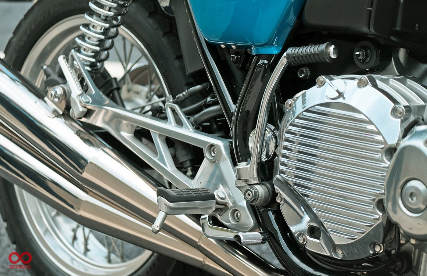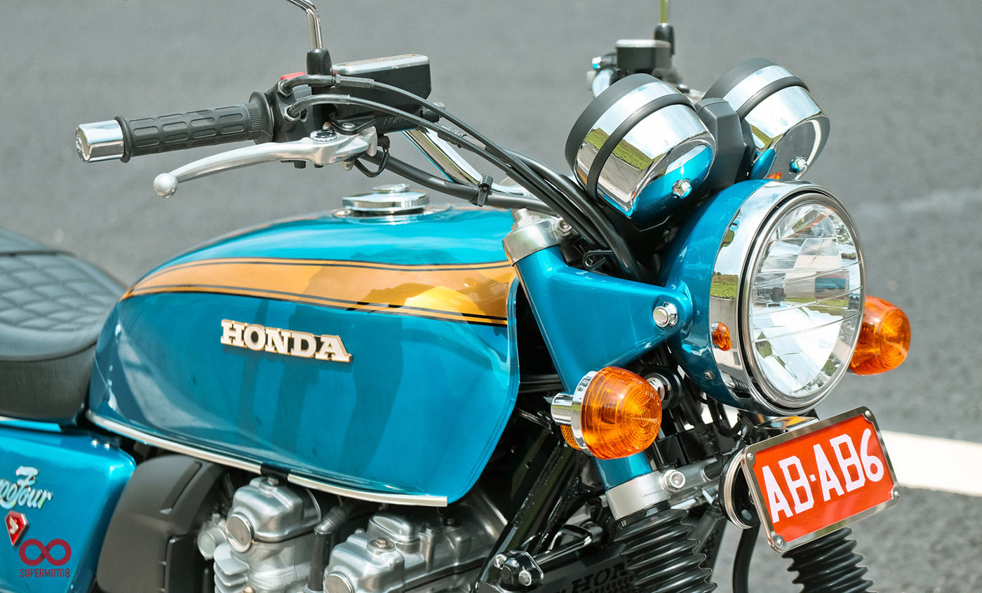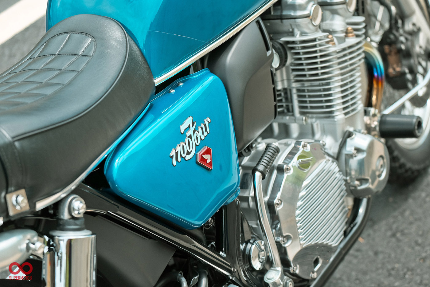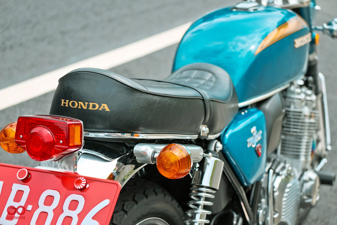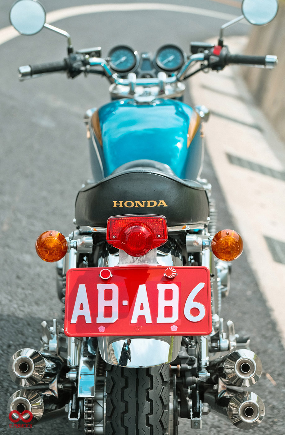 摻著綠的藍色復古油箱,畫上金色色塊黑色線條,一個完全立體的HONDA字樣,有種穿越時空的錯覺。 在細節上除了來自日本的知名套件外,改裝達人(健二)的細緻手路又再次流露出來。復古的滾邊皮座墊後方手工描繪出泛黃的HONDA字樣,更讓人驚訝的是他將老CB才有的腳踏桿裝上了CB1100,且完整度就如正CB750一般。