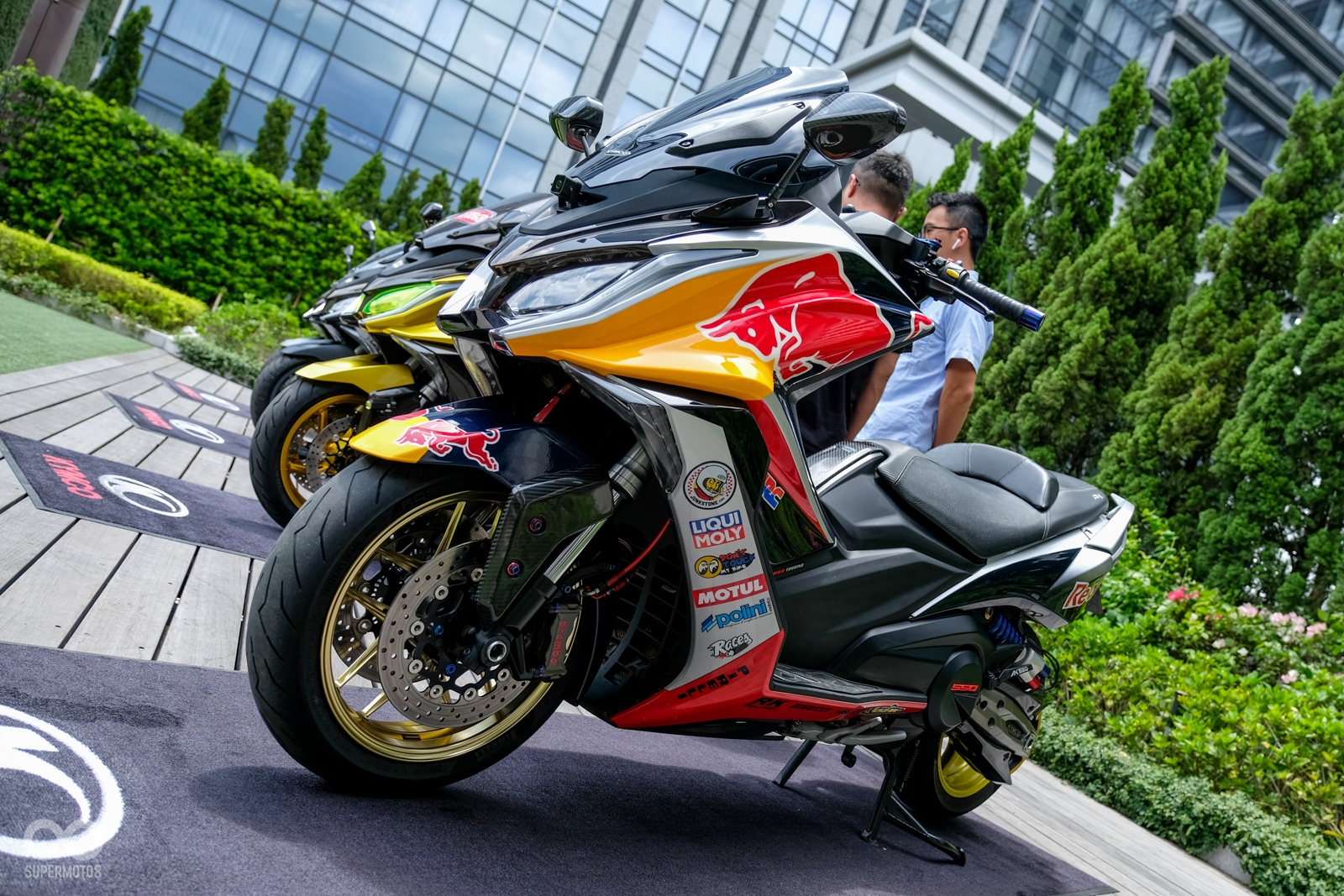 另一款車則是以搶眼的紅牛塗裝吸引許多人的目光,此塗裝並非透過貼膜而成,而是以精細的烤漆呈現,與前一輛車較為不同的是車主改裝了AK550專用鍛造輪框,減輕許多黃下重量。