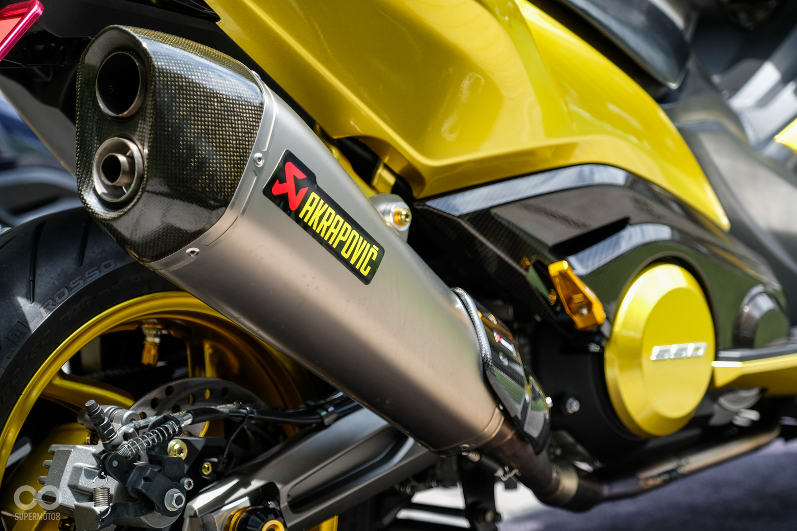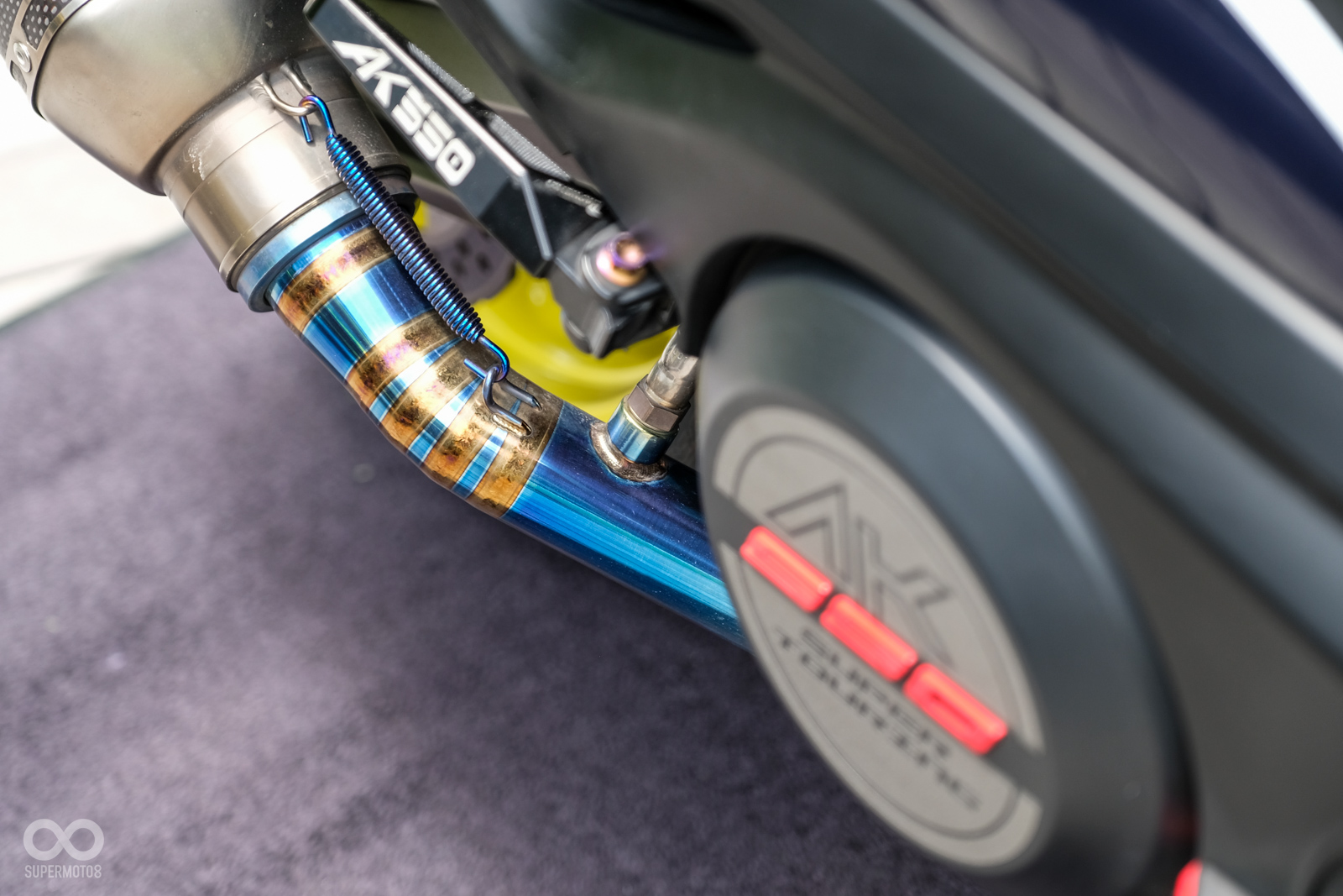 後避震則是選用MSP的改裝品,配上同樣來自Malossi的傳動組,排氣管前、中段透過焊接呈現出迷人的藍色,把手上同樣鈦色的手把橫桿,營造出較為濃厚的戰鬥氣息。
