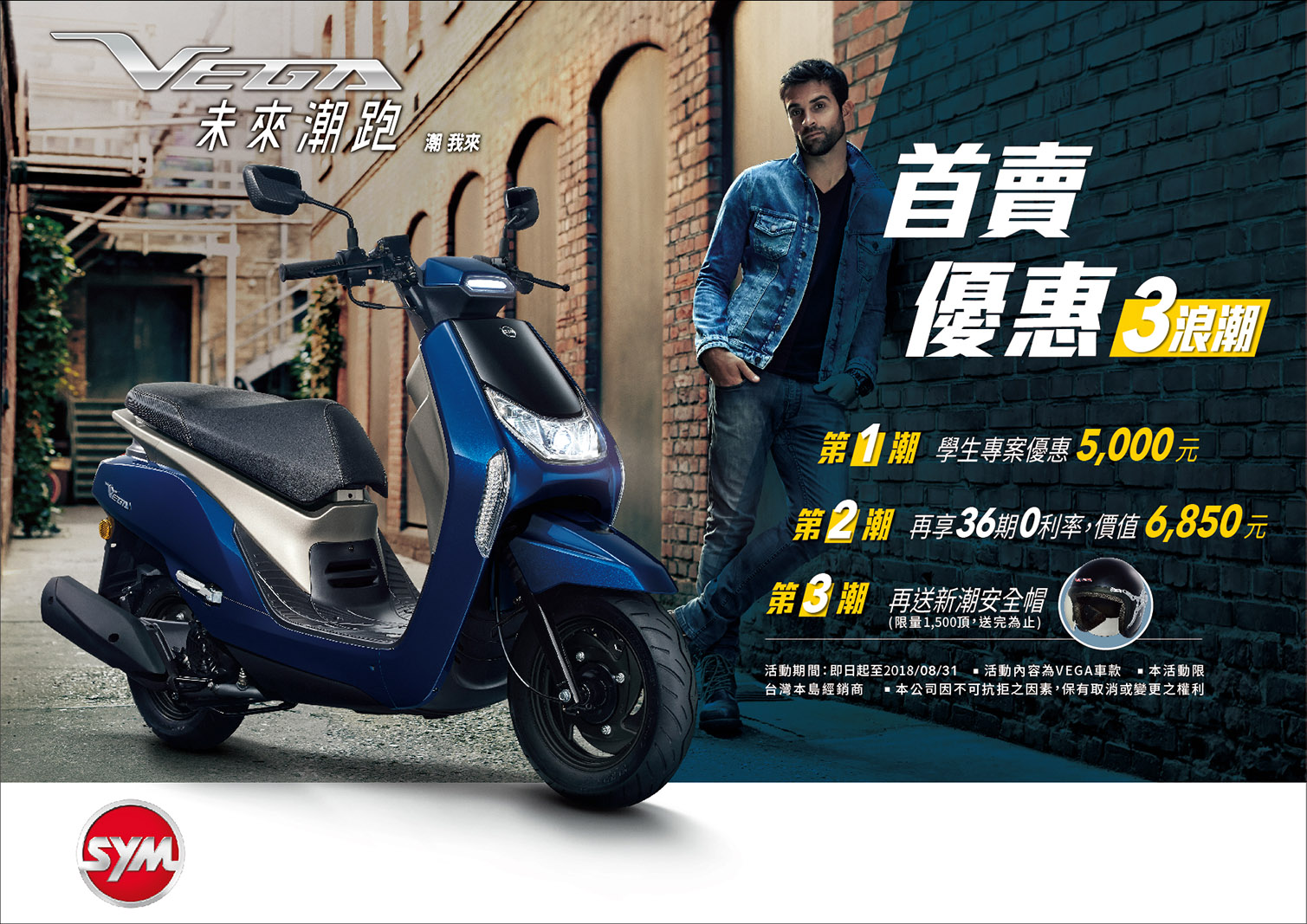 即日起至8/31,凡購買VEGA車款,即享潮流好禮三重送