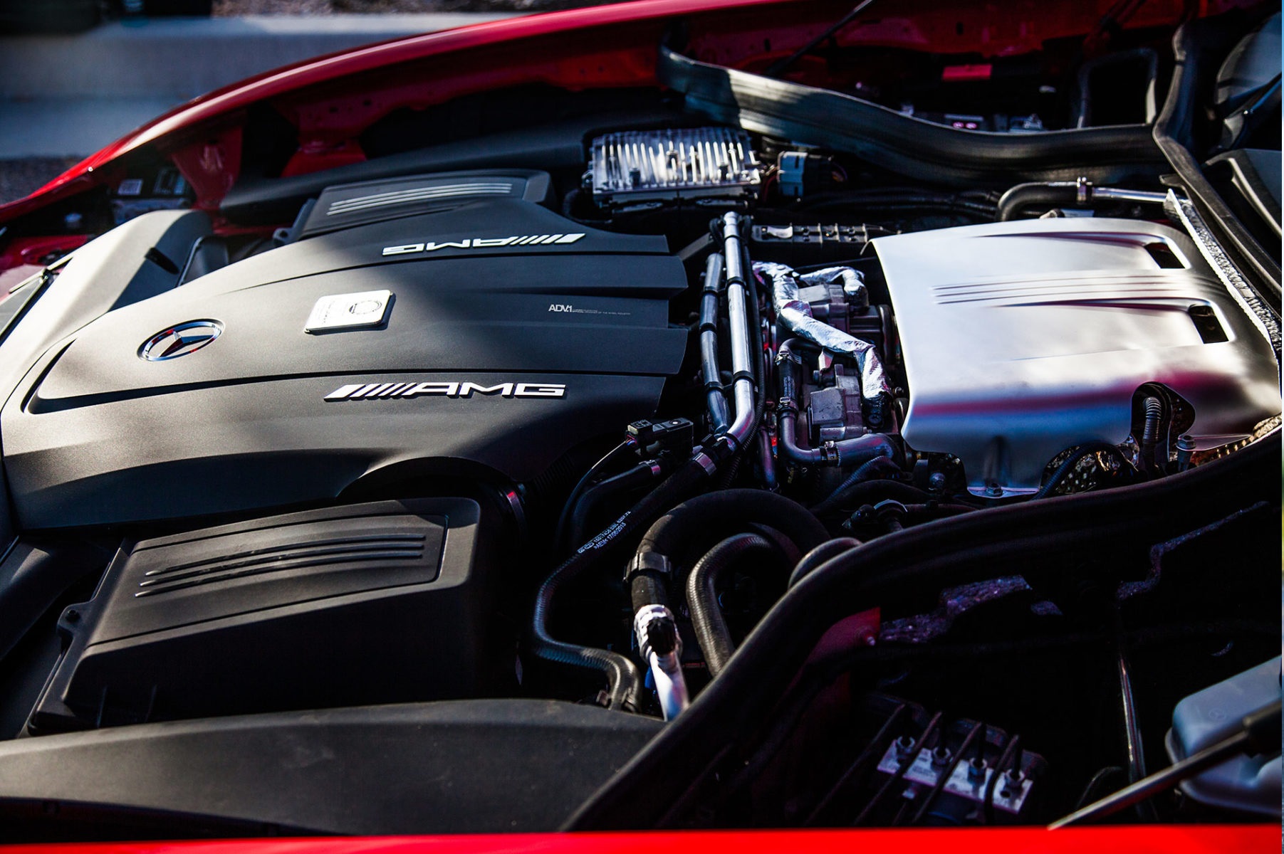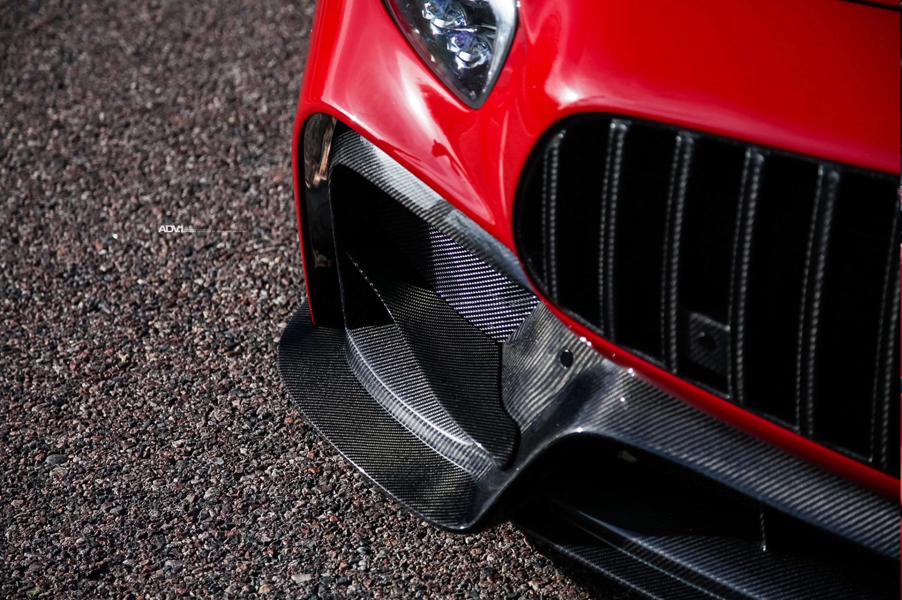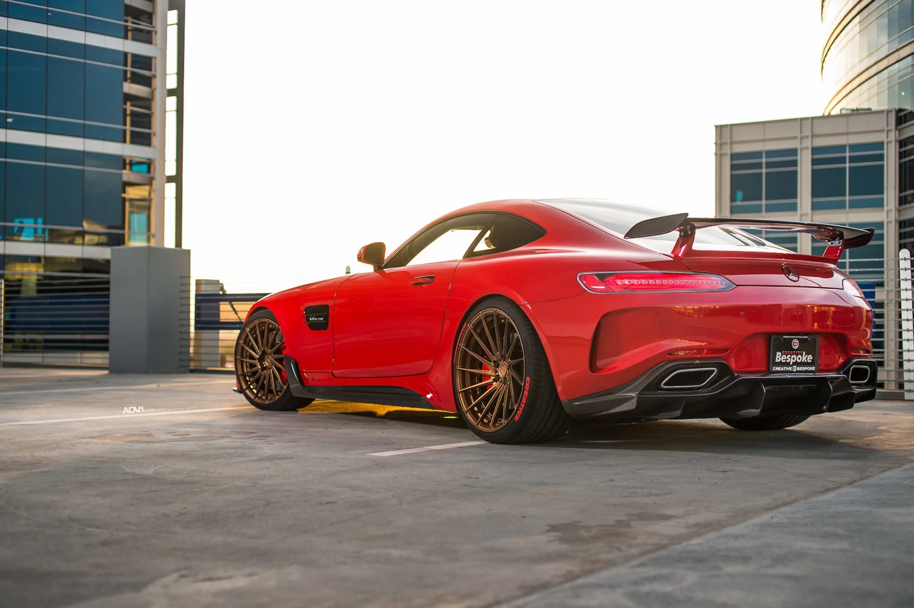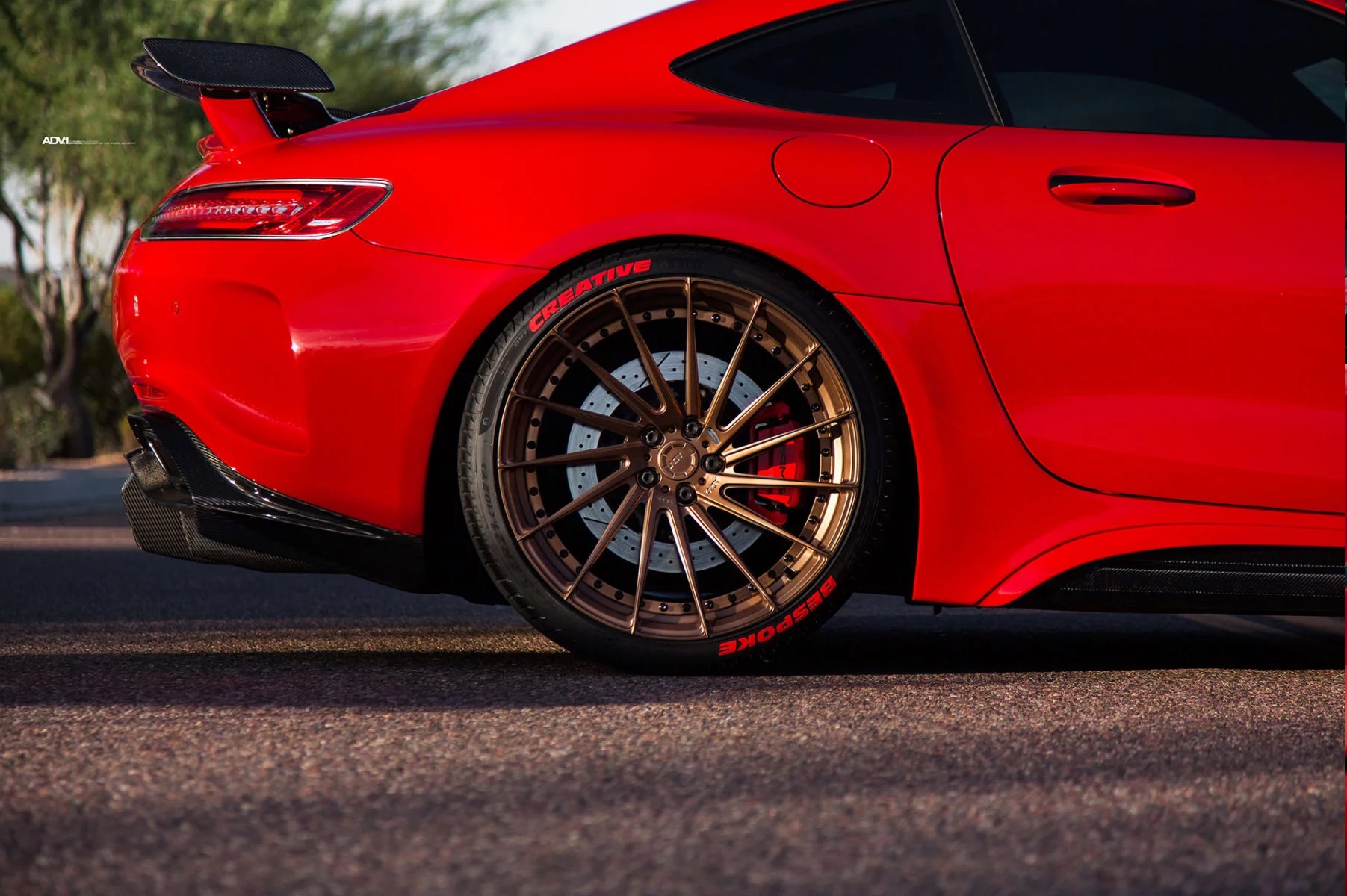 鋁圈選用ADV.1品牌,前為220吋10J、後為20吋12J,拋光的消光棕色帶有一點鈦金屬色澤,有如穿上了名牌球鞋般的帥氣。懸吊部分只換裝專為AMG GT所設計的H&R短彈簧,降低後的車身高度輪胎剛好能塞滿塞好整個輪弧,視覺上帶來低、趴的霸氣。最後,這輛AMG GT S車色選用了特殊的塗裝工法,塗裝Designo風信子紅色金屬色,車主似乎想要成為路上的注目焦點。