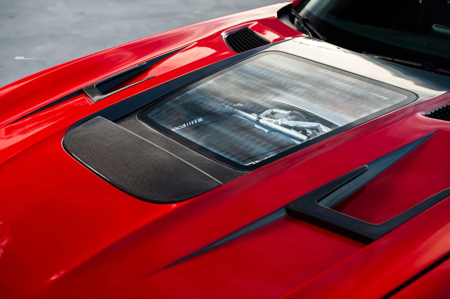 外觀有著非常搶眼的配色及空力套件,從車頭看去,最醒目是你不用打開引擎蓋就能看到裡面強大的V8引擎。全車搭載全新的車身套件,被稱之為Darwin Pro GTR,新的前保險桿有著大型進氣口加強散熱,也能提供最佳車頭下壓力,車側新的側裙有效穩定通過車測的氣流。車尾有大型的尾翼,這尾翼造型有點類似AMG GT R,想當然實質效果也不在話下。以上全車的空氣套件都為碳纖維材質,所以不會給車身重量帶來太大負擔。