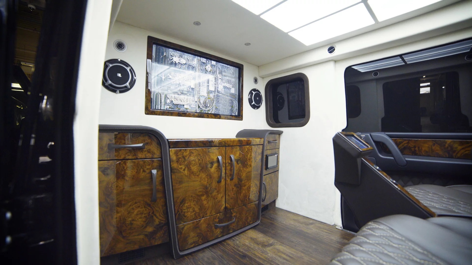 後排還配備了帶有Apple TV的4K超高清電視監視器,能使用Apple Siri的語音控制做任何資料查詢,附帶冰箱可存放任何飲品。兩張頂級座椅可完全傾斜休息,具備按摩功能來紓壓;同時乘客可透過控制鍵來調整有日光功能的頂棚,畢竟防彈車的玻璃為不可透視,模擬真實陽光的頂棚燈可減少疲勞度。