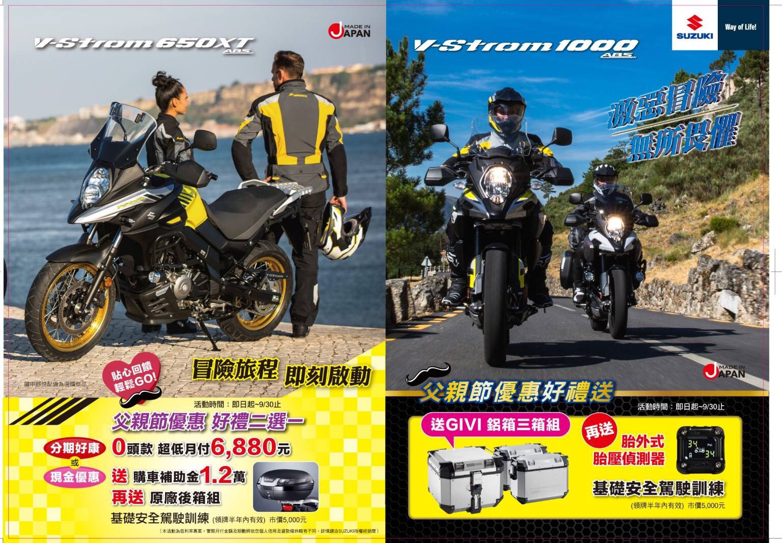 V-STROM 650XT /1000 激流冒險 無所畏懼 霸氣極光專案 限量推出 售完為止。台鈴SUZUKI特別提供V-STROM 650XT /V-STROM 1000限量各10組霸氣極光專案,熱情回饋扛起家中辛勞的爸爸們。