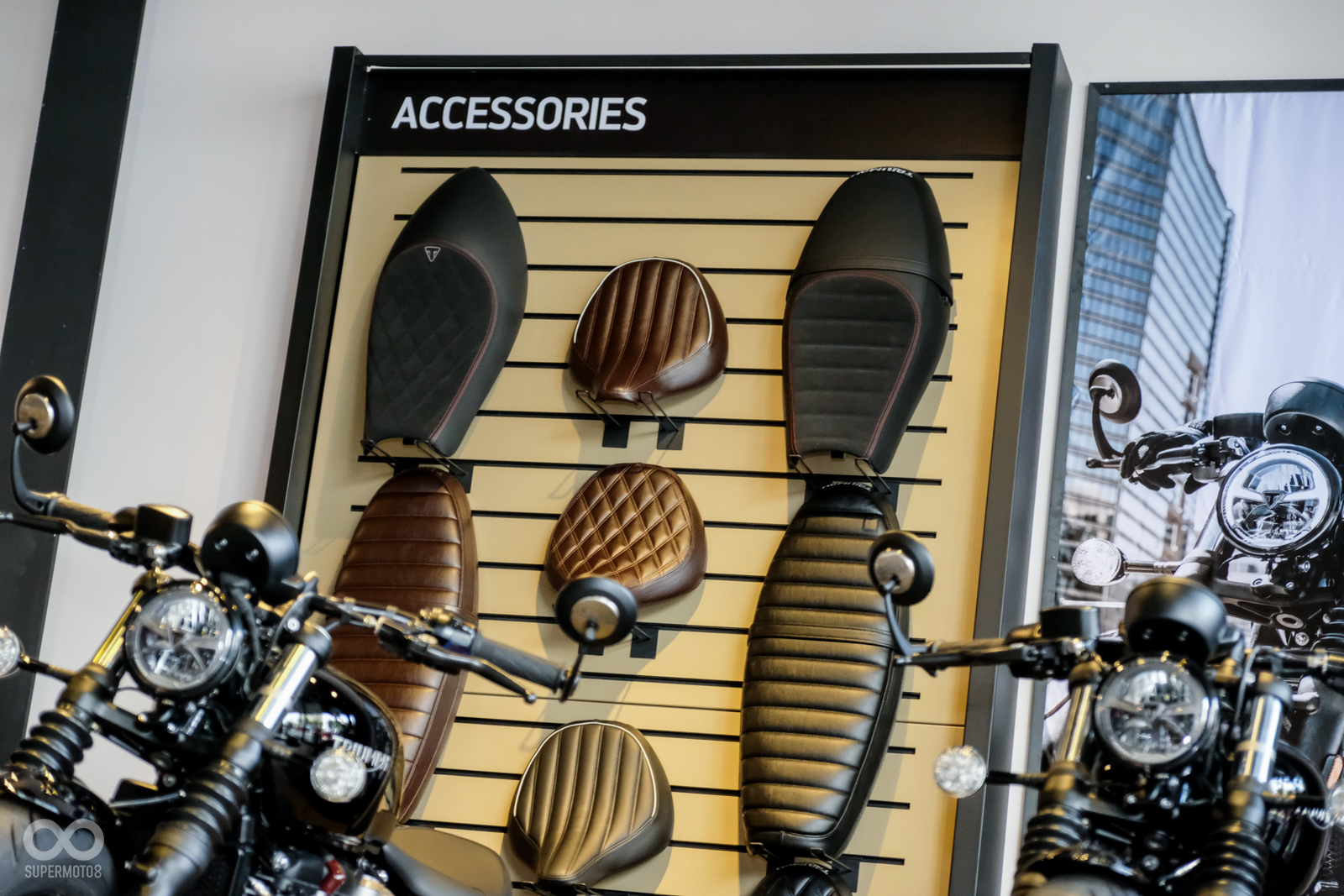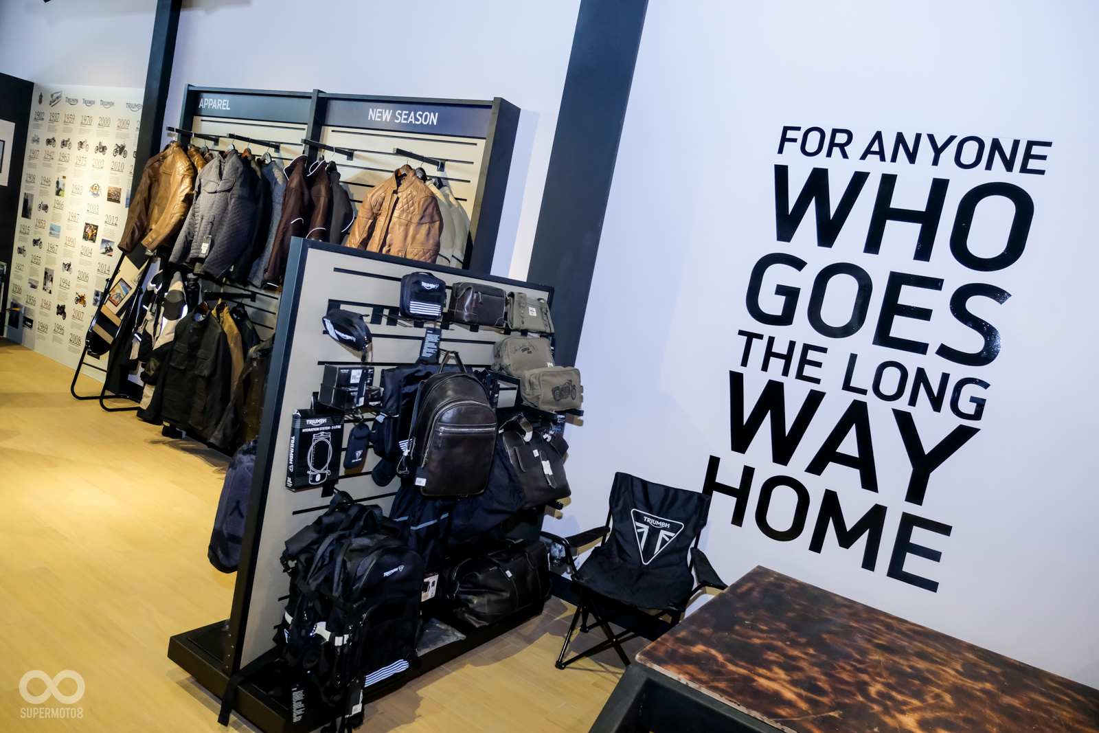 全新的TRIUMPH高雄旗艦店採一樓挑高設計,碩大的空間感陳列出TRUMIPH全車系車款供顧客欣賞,但筆者覺得最值得一提的是玲瑯滿目的週邊配件,從車輛改裝品到旅行箱等配件一應俱全,甚至還有帥氣的皮衣、皮靴、背包等隨身配件可供選購。