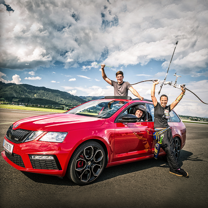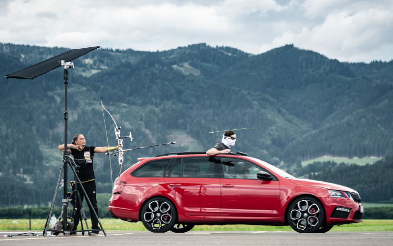 在這支短短45秒的影片當中,包含了許多元素,當然最重要的還是影片當中的Octavia Combi RS 245,與射箭的結合就是為了創造出車輛擁有極佳的加速表現,在影片當中擔任射箭主角的是奧地利的奧運選手Laurence Baldauff,另一位主角則是武術教練Markus Haas,精彩的地方就是Laurence要射出手中的箭,而Markus將會在Octavia RS上接著這支箭,聽起來好像沒有太難,可是射箭位置跟箭靶只有70公尺而已,而飛箭的速度大概只有每秒216km/h而已啦!也就是一秒左右的時間要完成所有動作,更不用說因為飛箭飛行會有弧度,大概只有0.5秒的瞬間可以把握,如果你覺得不難,你就來試試看吧!
