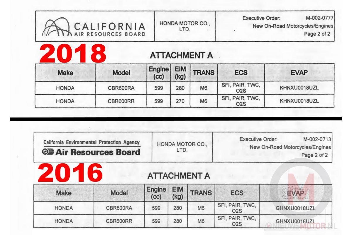 來自CARB(加州空氣資源委員會)的文件指出,HONDA在近期送驗了CBR600RR的測試資料,其中的等效慣性質量(EIM)比舊款車型輕了10公斤左右,雖然EIM數值不等於車輛的直接重量,但是明顯的差異幾乎可以推斷出這是全新的車款。