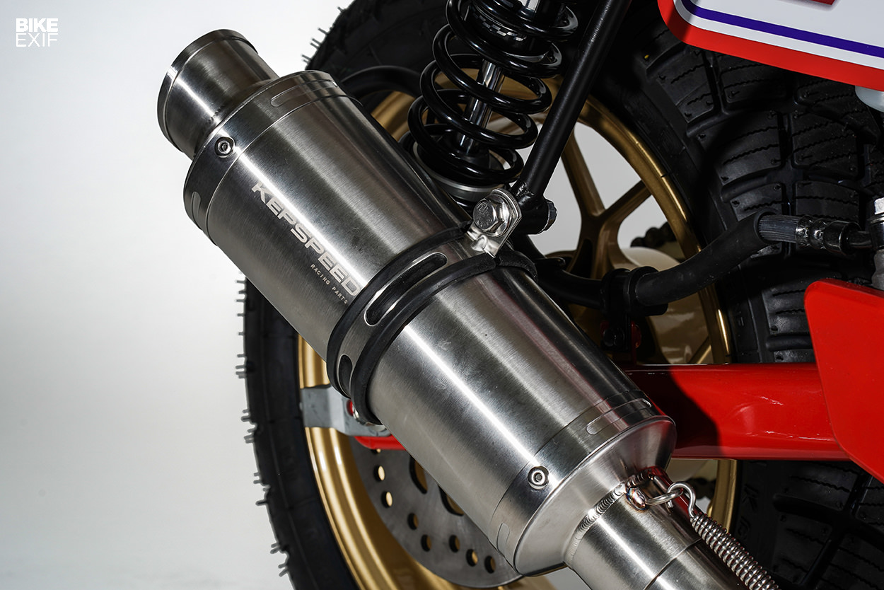這輛由Kingston Custom所改裝的Monkey中少數的改裝品則是後避震器與排氣管,後避震器並沒有被換上越野味濃厚的長行程款式,反而是由YSS所提供,較貼近公道使用的產品,排氣管也同樣由改裝品替代,輕盈的重量為車輛性能帶來幾分加分效益。