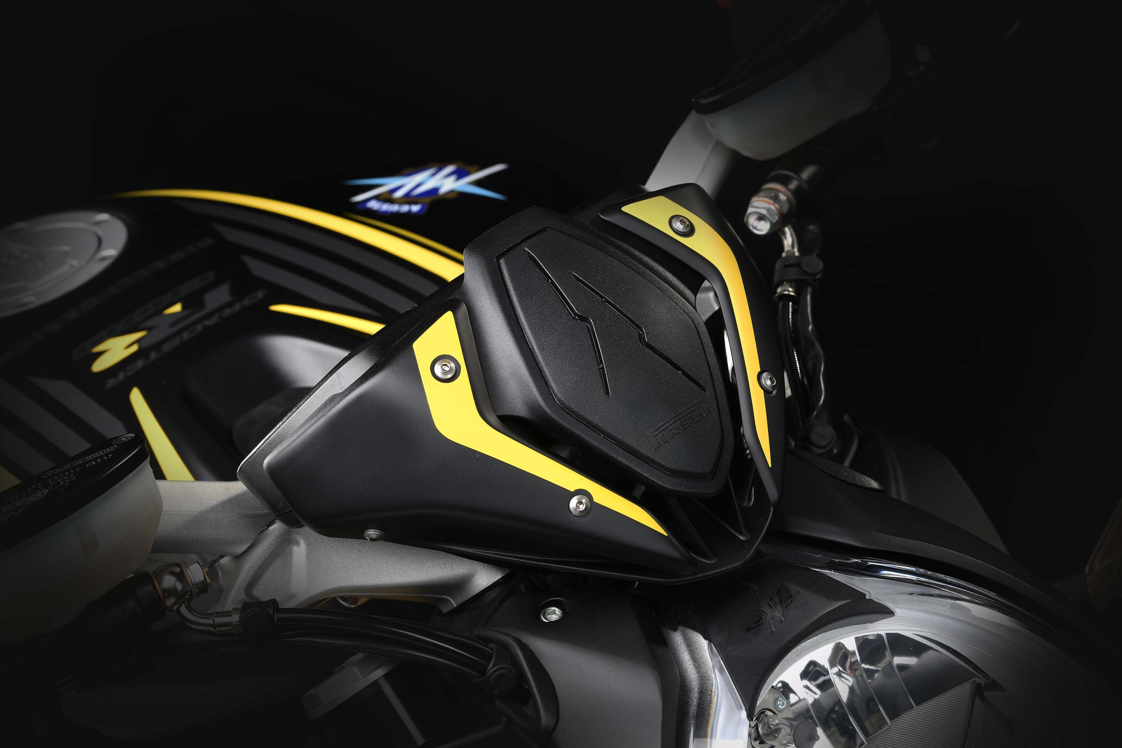 這次MV Agusta與世界知名輪胎大廠Pirelli再次攜手合作,同樣交由Pirelli Design團隊來著手進行外觀上的設計,與過去的模式相同,推出了黑黃、白藍兩種不同車色的版本,兩個版本在外觀上,都有著大量的Pirelli輪胎的經典元素,像是大閃電的圖示,以及象徵惡魔的D字圖案。