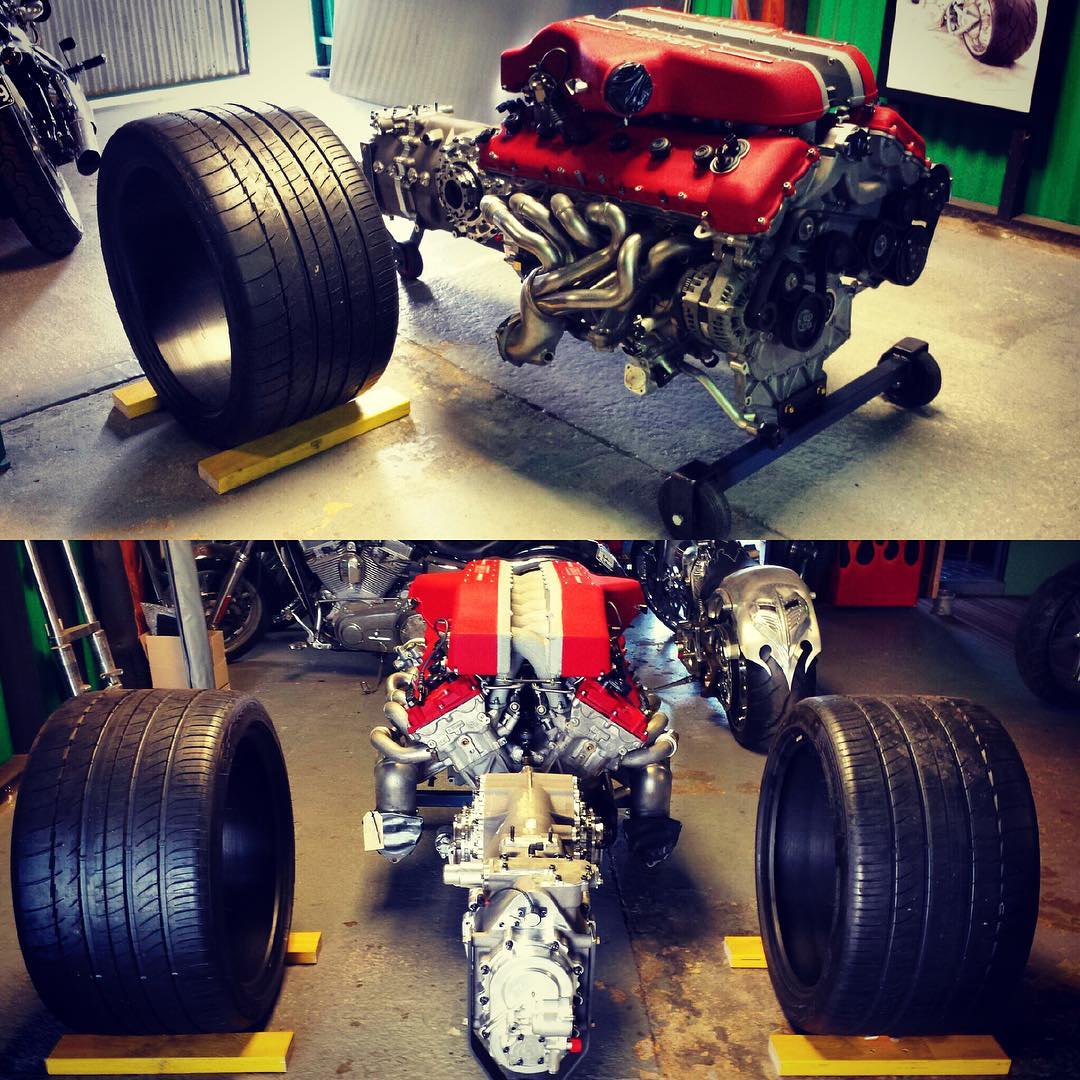 因為上述的原因,Mihajlovic從一輛於英國撞毀的F12 Berlinetta當中,買下了那6.3L的V12狂暴引擎,並且開始認真研究這輛車,搭配上來自Albins的六速變速箱,Albins同時也是澳洲超級跑車系列賽的變速箱製造廠商,相信在妥善率以及可承受的力道絕對沒有問題,除此之外還可以看到車身採用了全鋁合金打造,包含了許多空力套件的系統,但這些空力套件可能沒有經過風洞實驗,究竟在高速的表現會如何,沒有人敢保障,但可以知道的是這輛車進出停車場沒有問題,因為他還裝有了液壓升降系統。