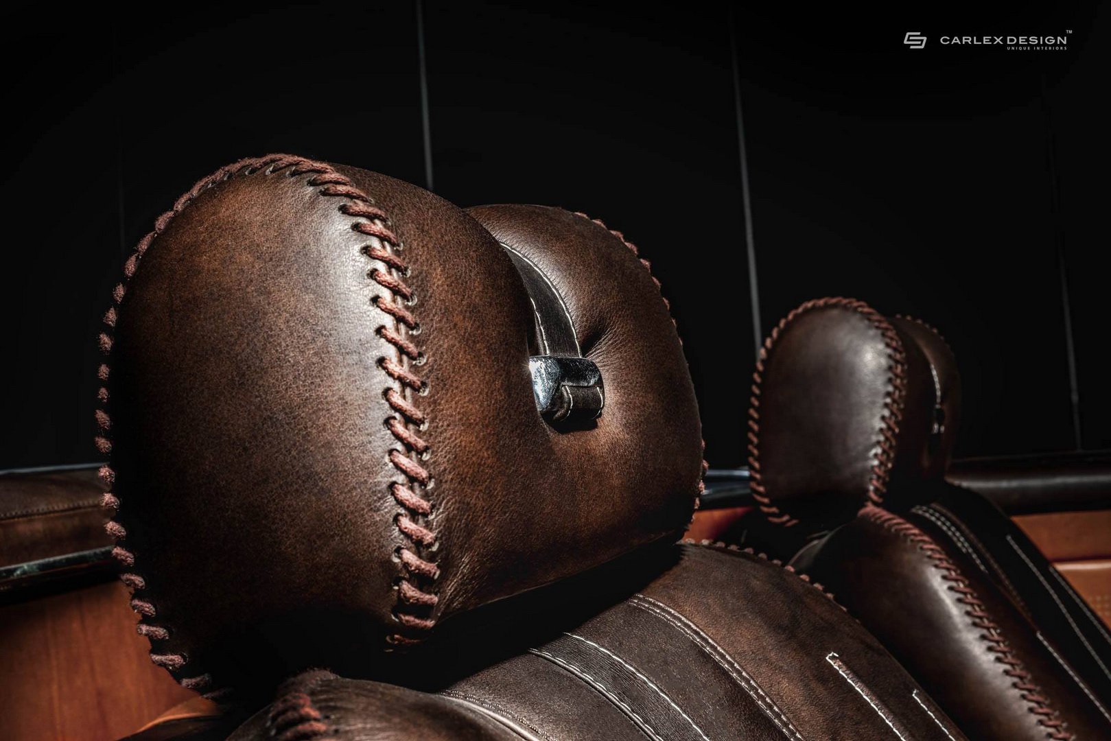 無論是從儀表板上半部到下半部、座椅、中央中控台、中央扶手、車門板還是腳步空間,Carlex Design運用很多雙色皮革來點綴。而皮革的縫線特別搭配粗線,就有點類似棒球手套的作法,內裝充斥著濃濃皮革氛圍。除此之外,皮革訂製的門把、車內垃圾桶以及位於後座訂製的置物盒,皮革是車內唯一的裝飾品。