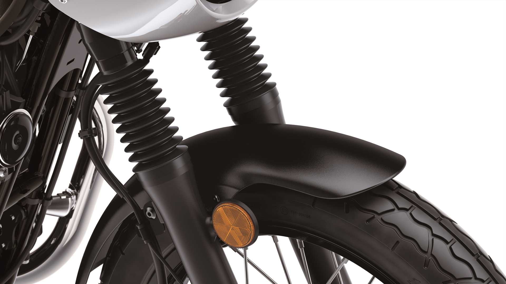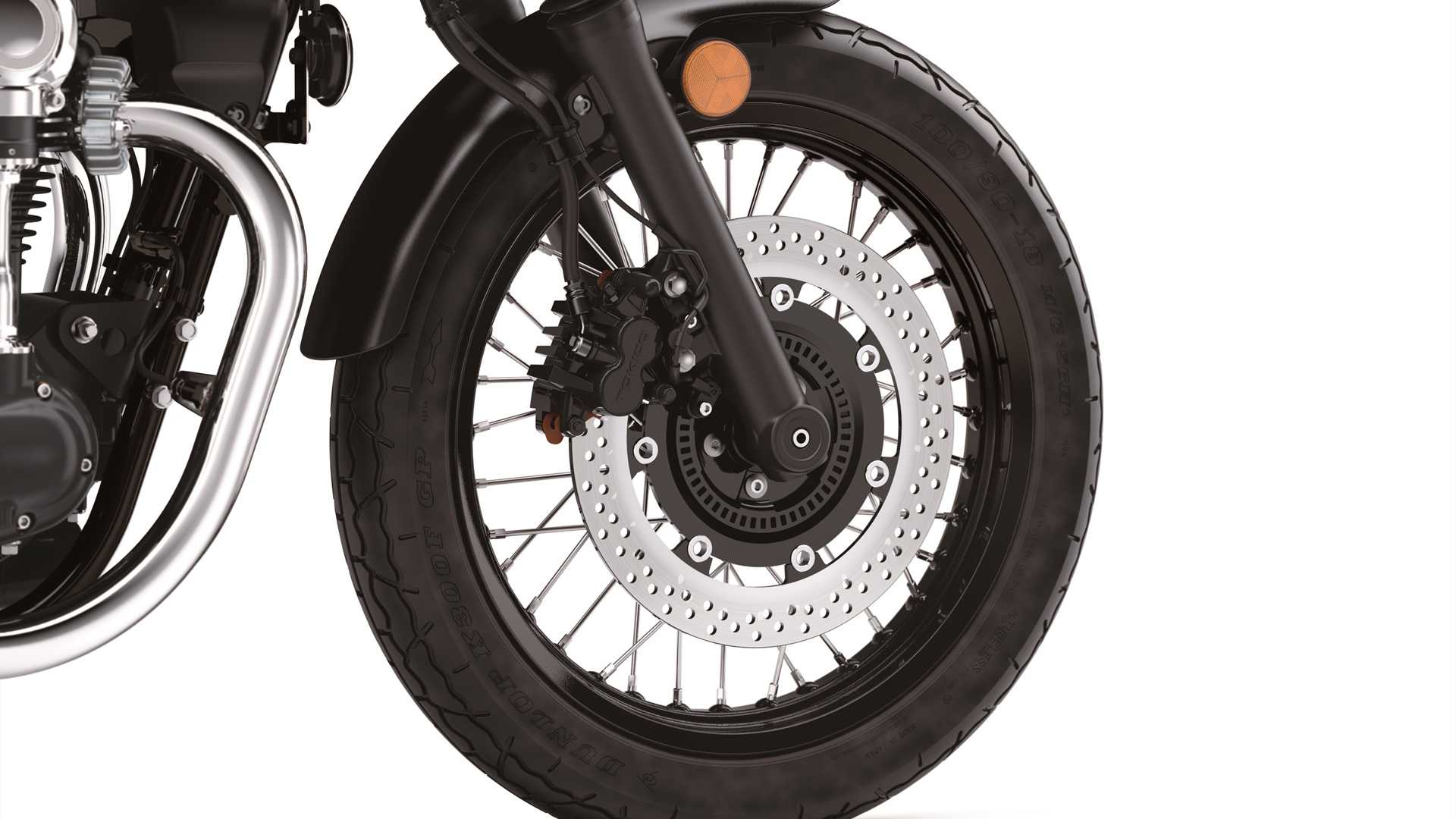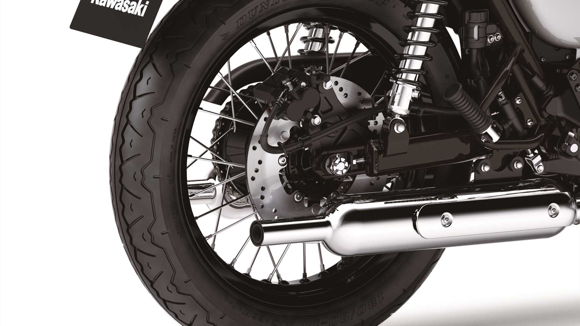 2019 KAWASAKI W800在制動系統部分也做出了現代化的更新,在前後輪都採用單碟煞的設計,不同於過去前碟後鼓的煞車配置,而且這次的煞車制動也配上了ABS防鎖死煞車系統,讓安全性能更往上提升。
