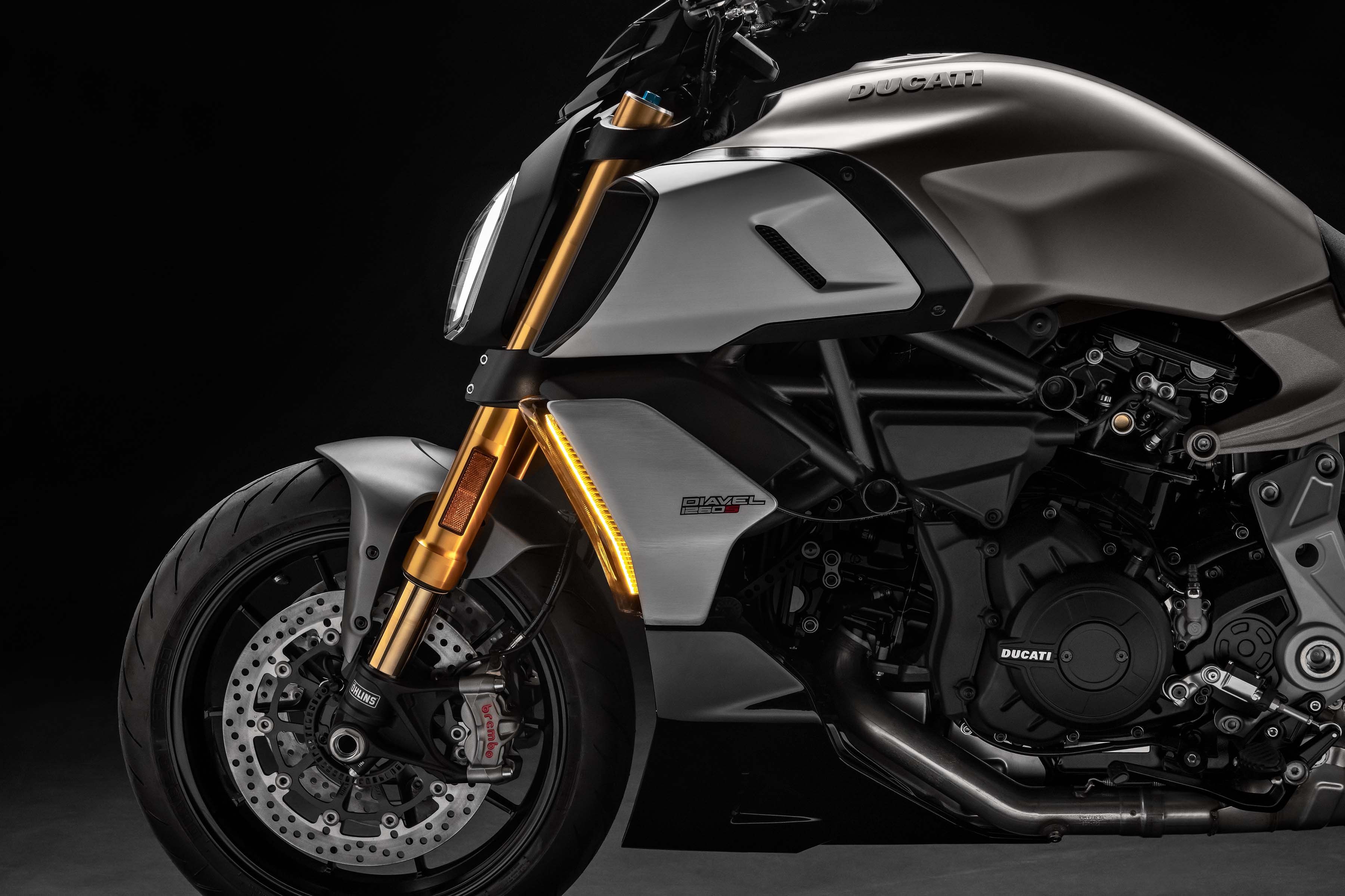 燈具一直都是Diavel展現霸氣與邪惡氣息的主要武器,真要說的話,其實Volkswagen 集團旗下對於燈具設計上我實在五體投地。日行燈以惡魔獠牙的形式呈現在頭燈燈具上方,有些類似XDiavel的帶點邪氣的暗黑格調,兩旁的方向燈與後方向燈也同樣也以直條式的設計來呼應整體車頭與車身造型,不突兀之餘當然充斥的滿滿殺氣。Brembo M50卡鉗與全可調的Ohlins懸吊,搭配特殊加工的輪框以及快排系統。