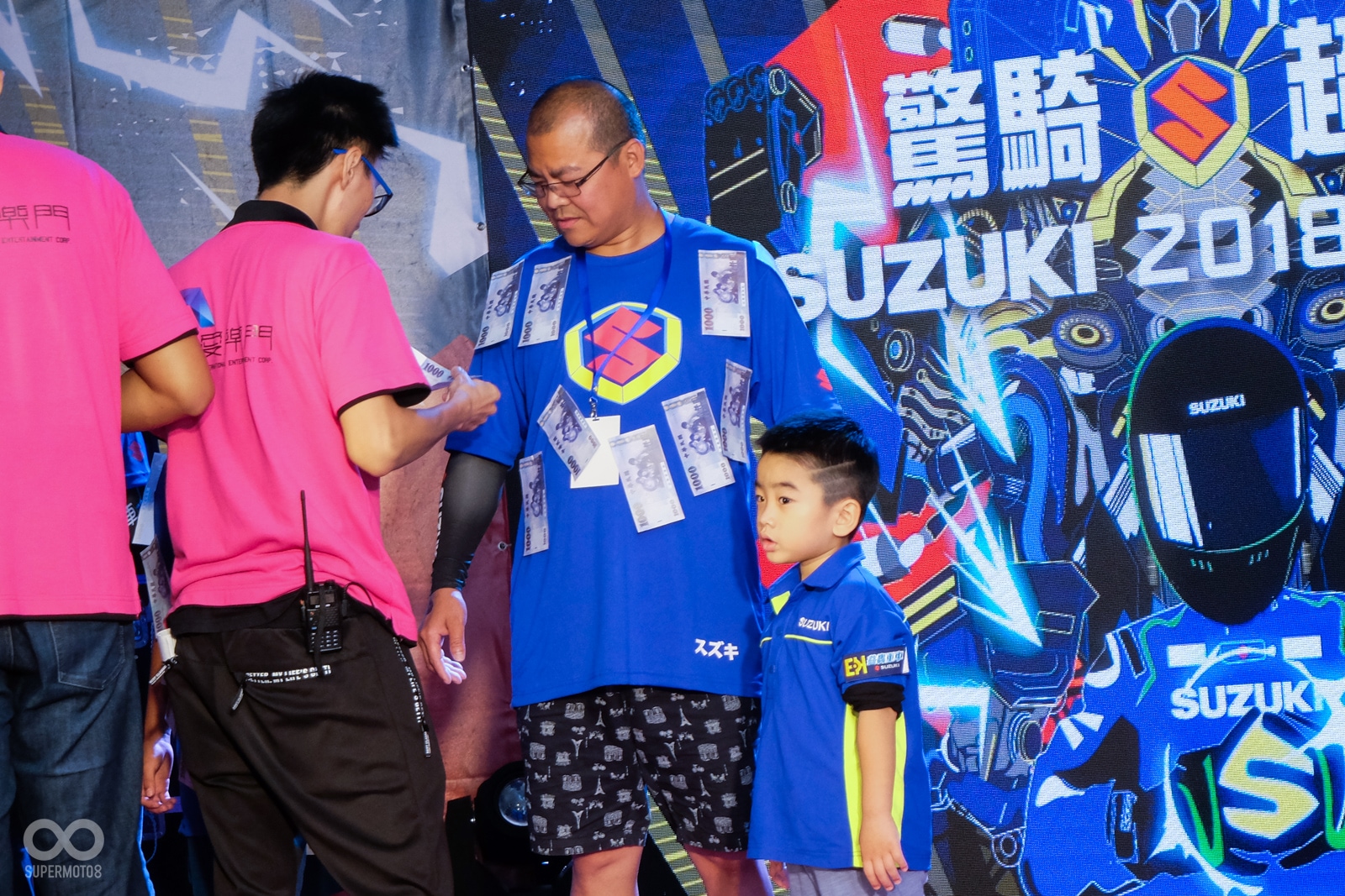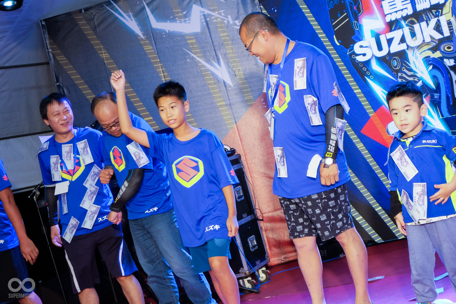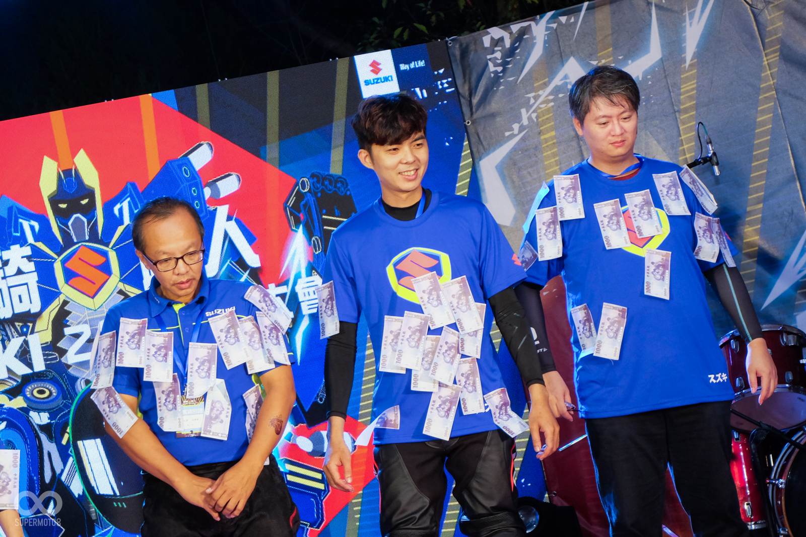 SUZUKI 台鈴工業這次大會師安排的趣味活動也真的相當有趣,每一位代表參賽的車友,都必須在身上黏上15張千元玩具紙鈔,並且挑戰誰能在30秒內將所有的紙鈔抖下身,最快完成的車友就能晉級,並且有機會在最後替全桌車友贏下價值不菲的防風外套。