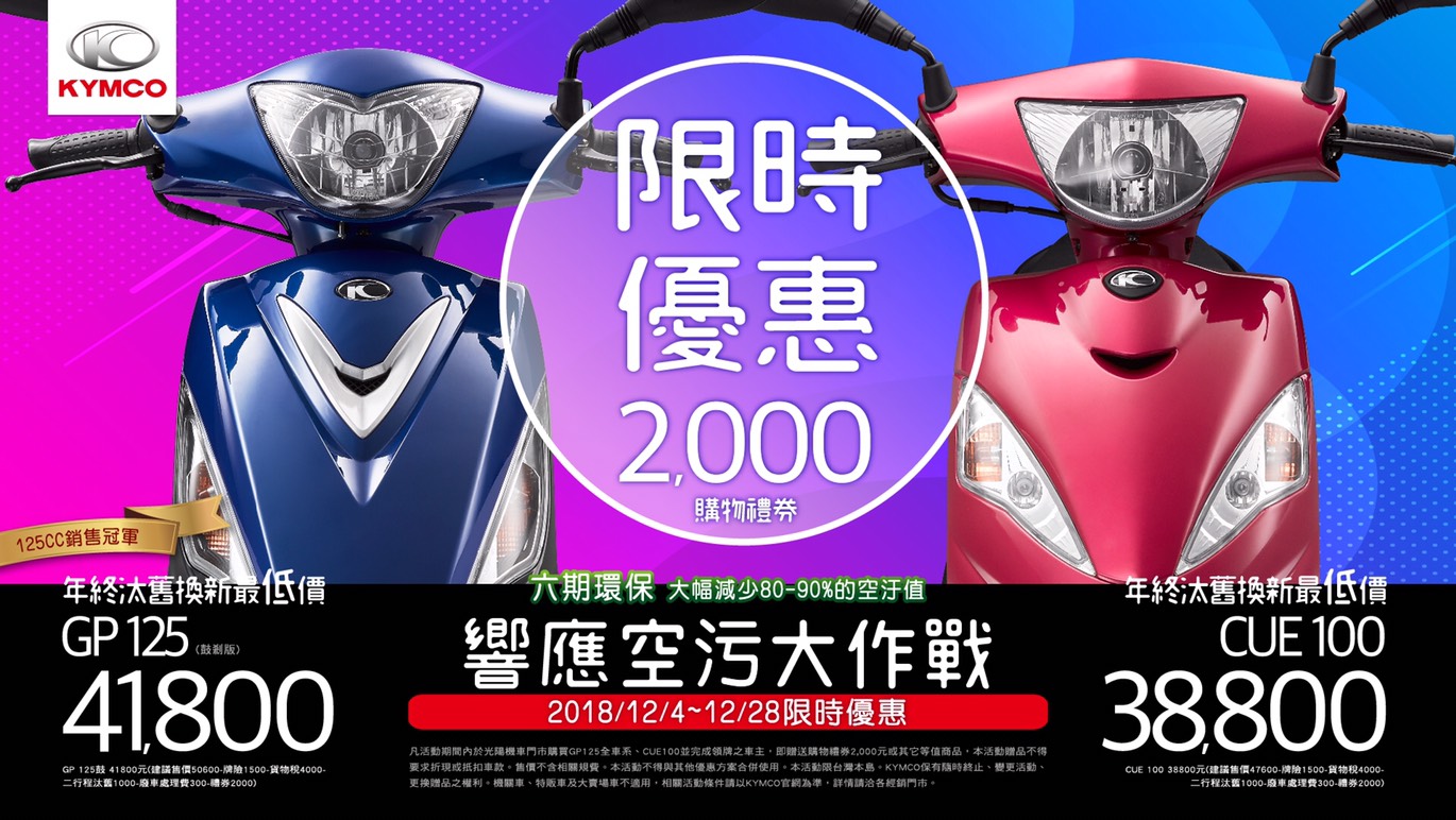 為了鼓勵民眾換購六期環保新車,除了中央政府推行的舊換新貨物稅減免4,000元、報廢車輛獎金300元以及環保署二行程報廢補助1000元以外,KYMCO更加碼於2018年底加贈購物金2,000元,讓CUE100來到38,800元,GP125鼓煞版也僅要41,800元,搶攻過年前的汰舊換新市場。
