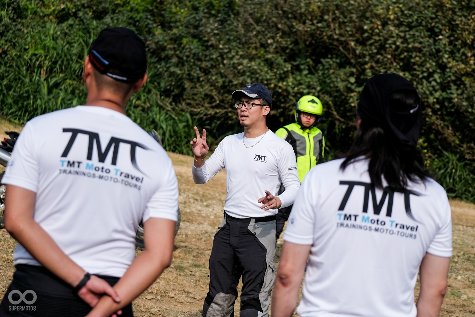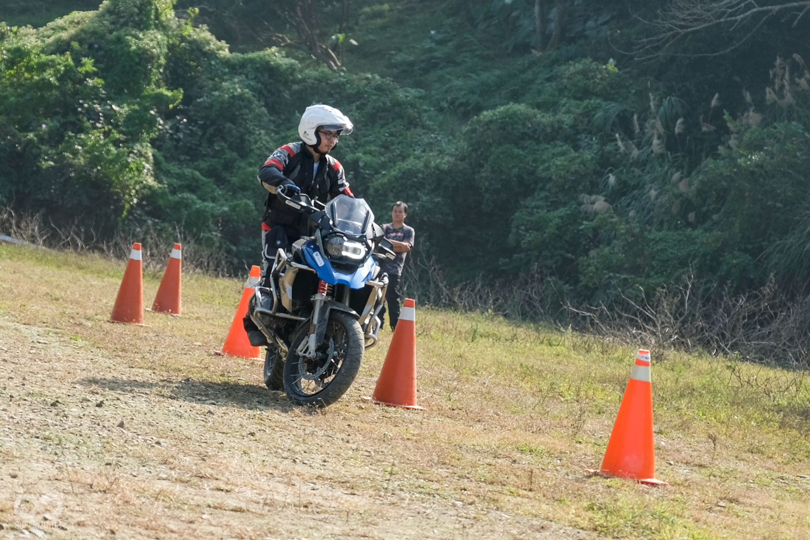 在學會並且實際體驗過倒車扶起之後,接著就是off-Road的騎乘姿勢教學,off-Road在騎乘姿勢與on-Road相當的不一樣,常常需要利用身體去平衡車輛,在腳踏位置、反向重心轉移、手肘姿勢、頭部與視線位置等都非常的重要,教練們也非常細心的替每一位學員調整姿勢。