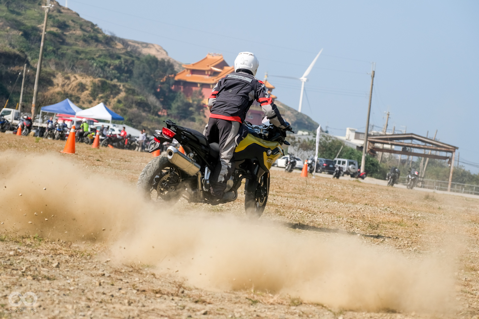 在中午大家用餐稍作休息之後,下午的課程繼續延續繞錐考驗,挑戰更進階的定點繞圈,教官也表示,今天所有的學員必須完成定點繞三圈,才能拿到本次課程的證書,別小看定點繞圓聽起來好像很容易,在off-Road充滿小碎石的路面上,除了要克服低速跳動摔車的恐懼之外,視線的轉移也是這個關卡的重點。